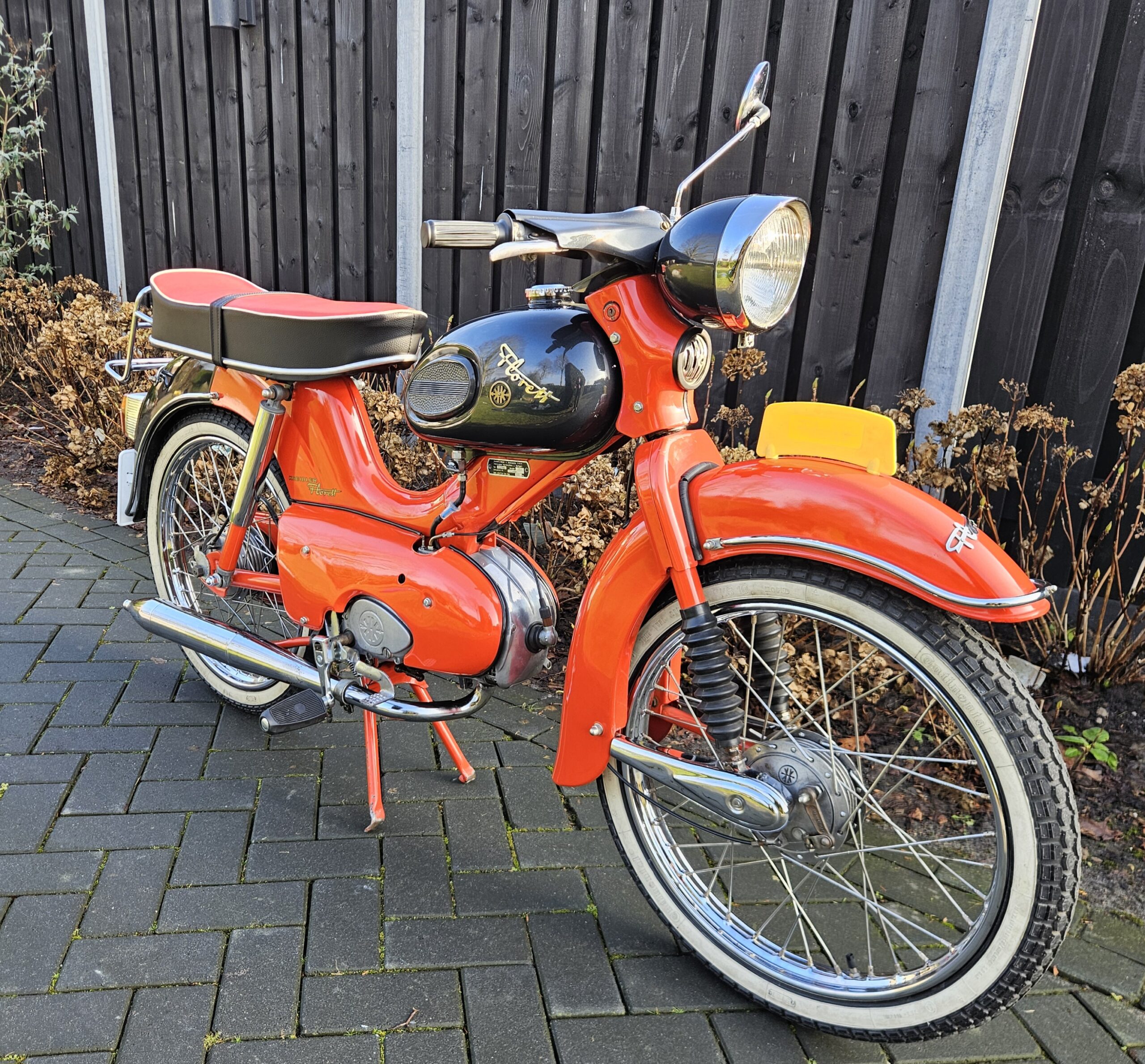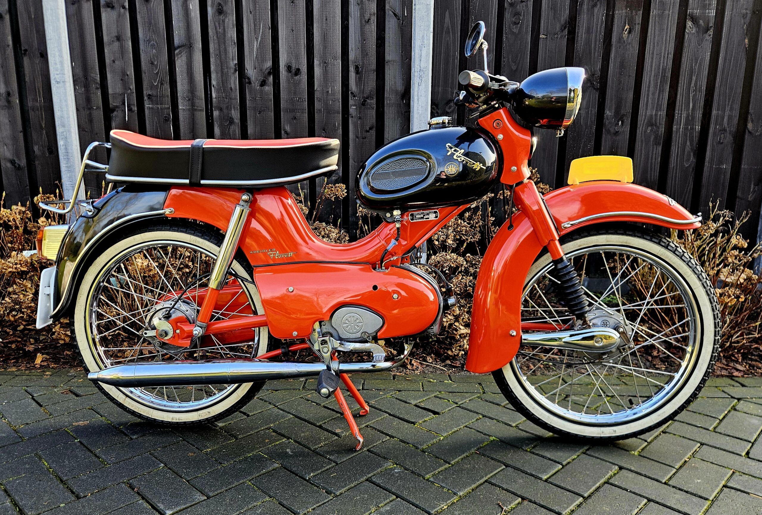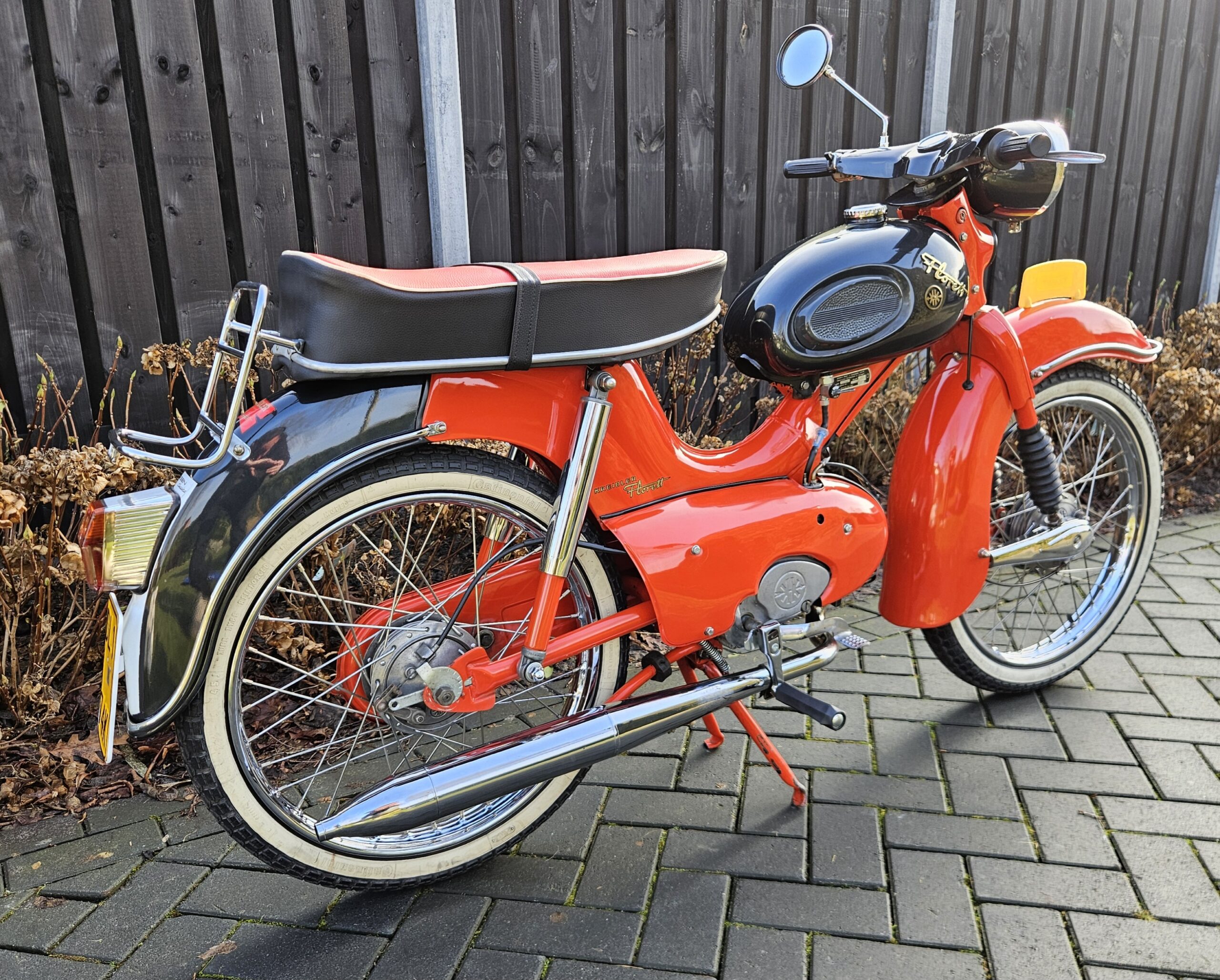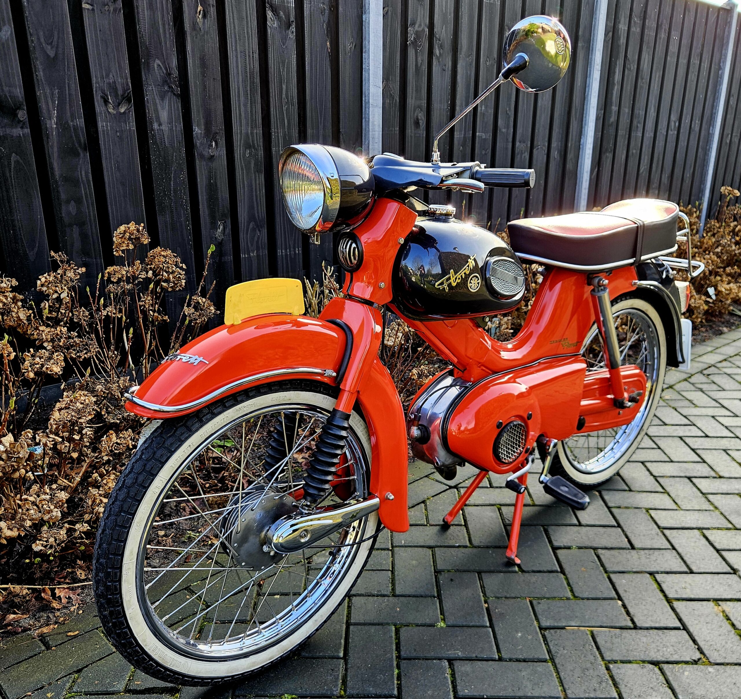 Kreidler Florett Eitank uit 1965. Het betreft een oudere restauratie die er nog zeer goed uitziet. Voorzien van een gereviseerde 3-bak voetgeschakeld en een nieuwe cilinder en zuiger. Lekker touren op dit stukje nostalgie uit de jaren ’60 of gewoon in de woonkamer zetten, want daar is hij echt mooi genoeg voor.