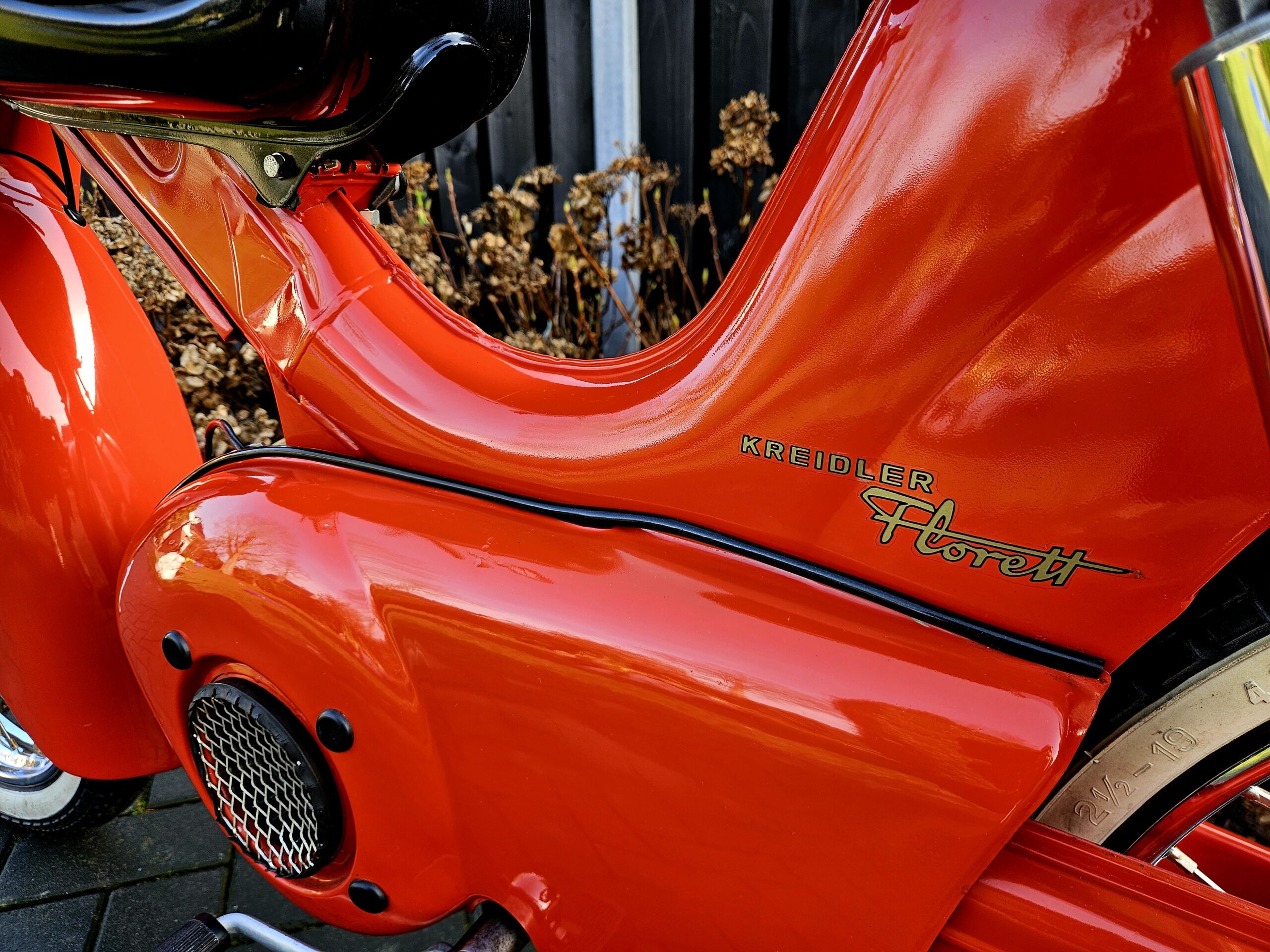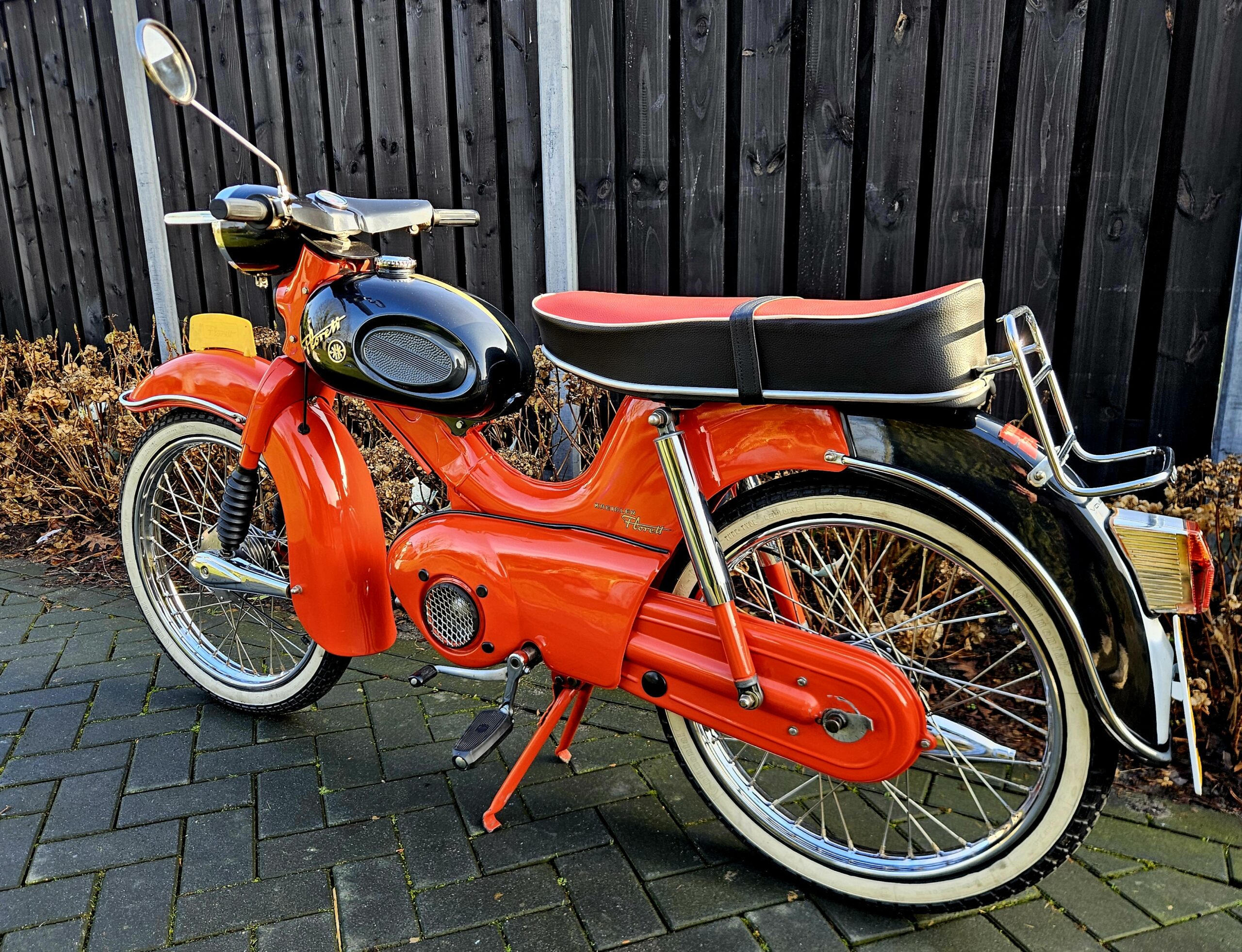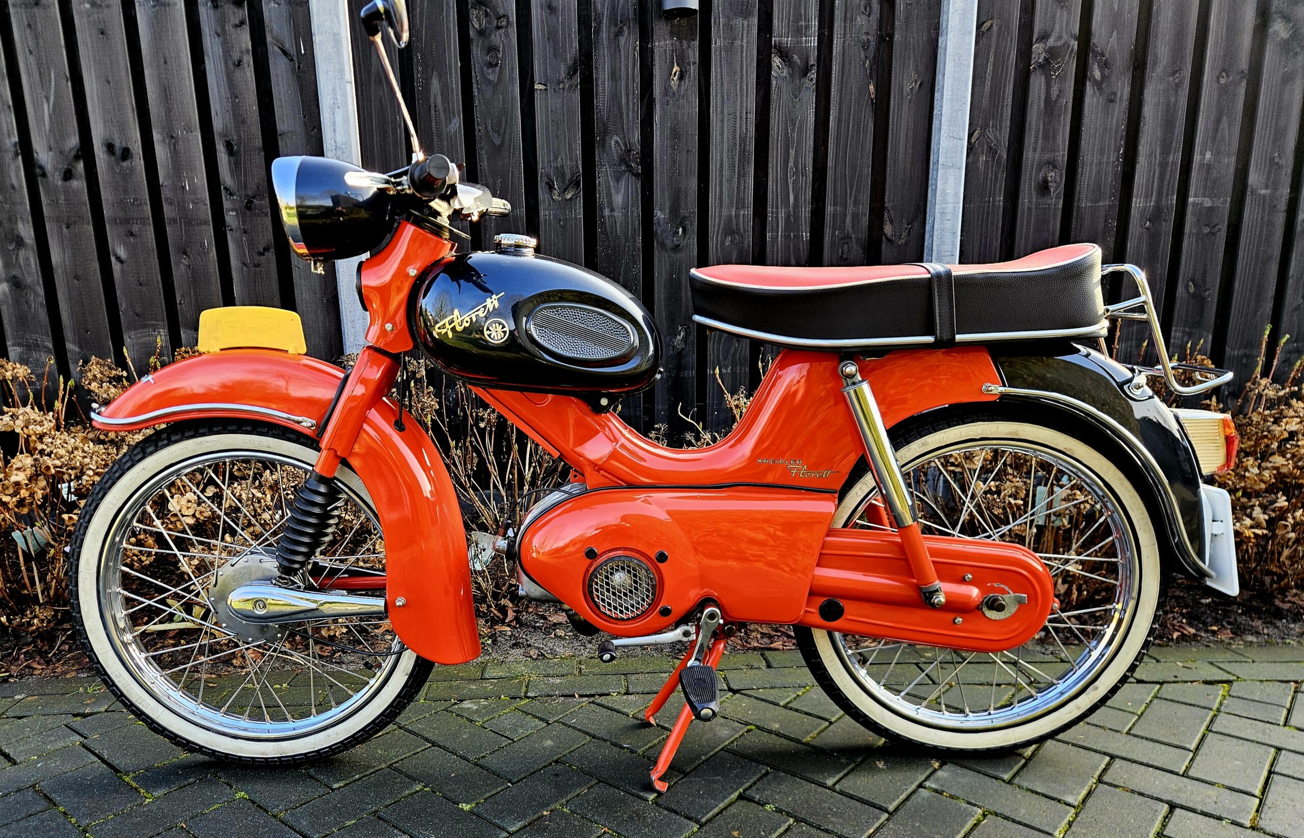 Kreidler Florett Eitank uit 1965. Het betreft een oudere restauratie die er nog zeer goed uitziet. Voorzien van een gereviseerde 3-bak voetgeschakeld en een nieuwe cilinder en zuiger. Lekker touren op dit stukje nostalgie uit de jaren ’60 of gewoon in de woonkamer zetten, want daar is hij echt mooi genoeg voor.