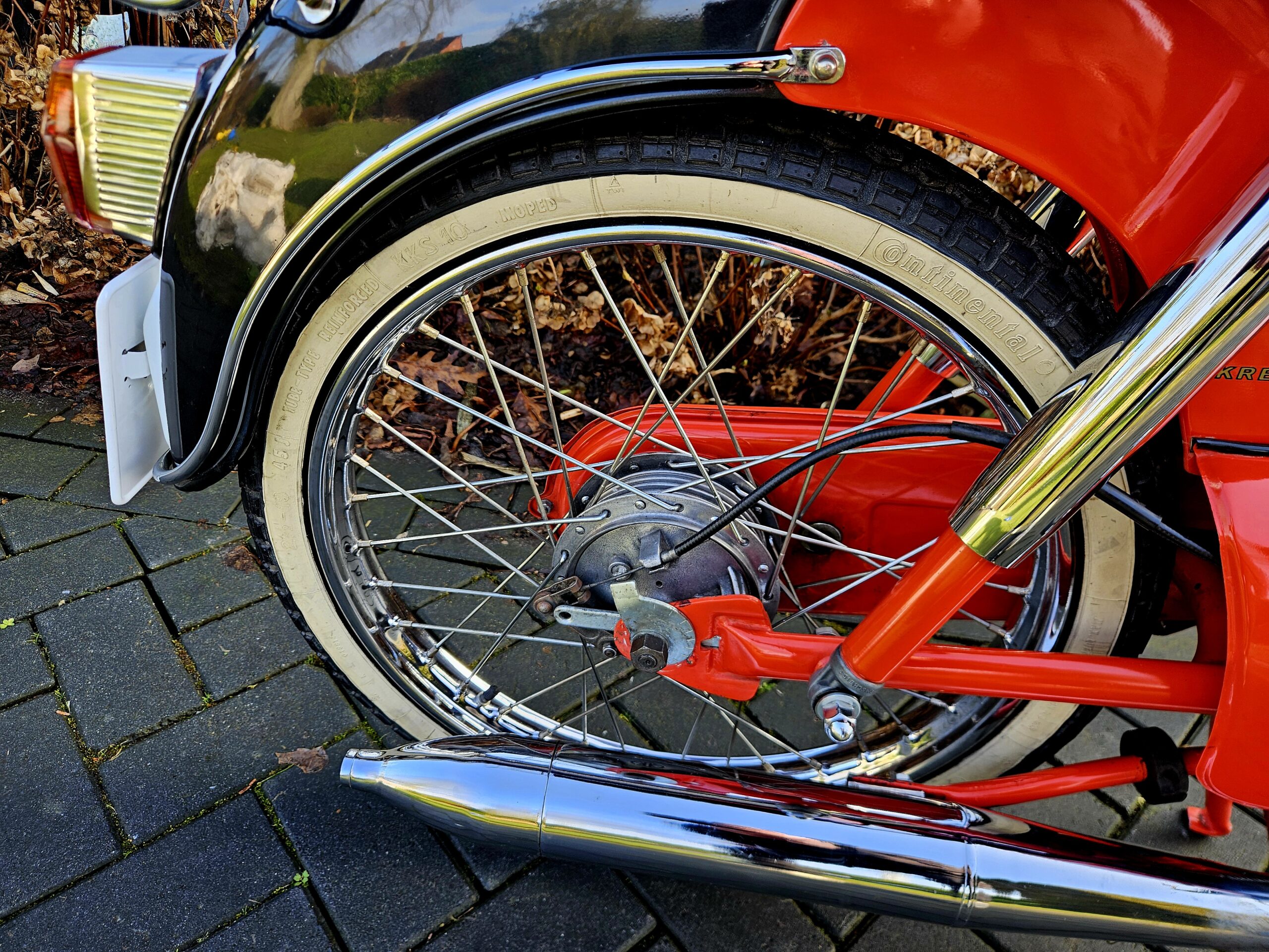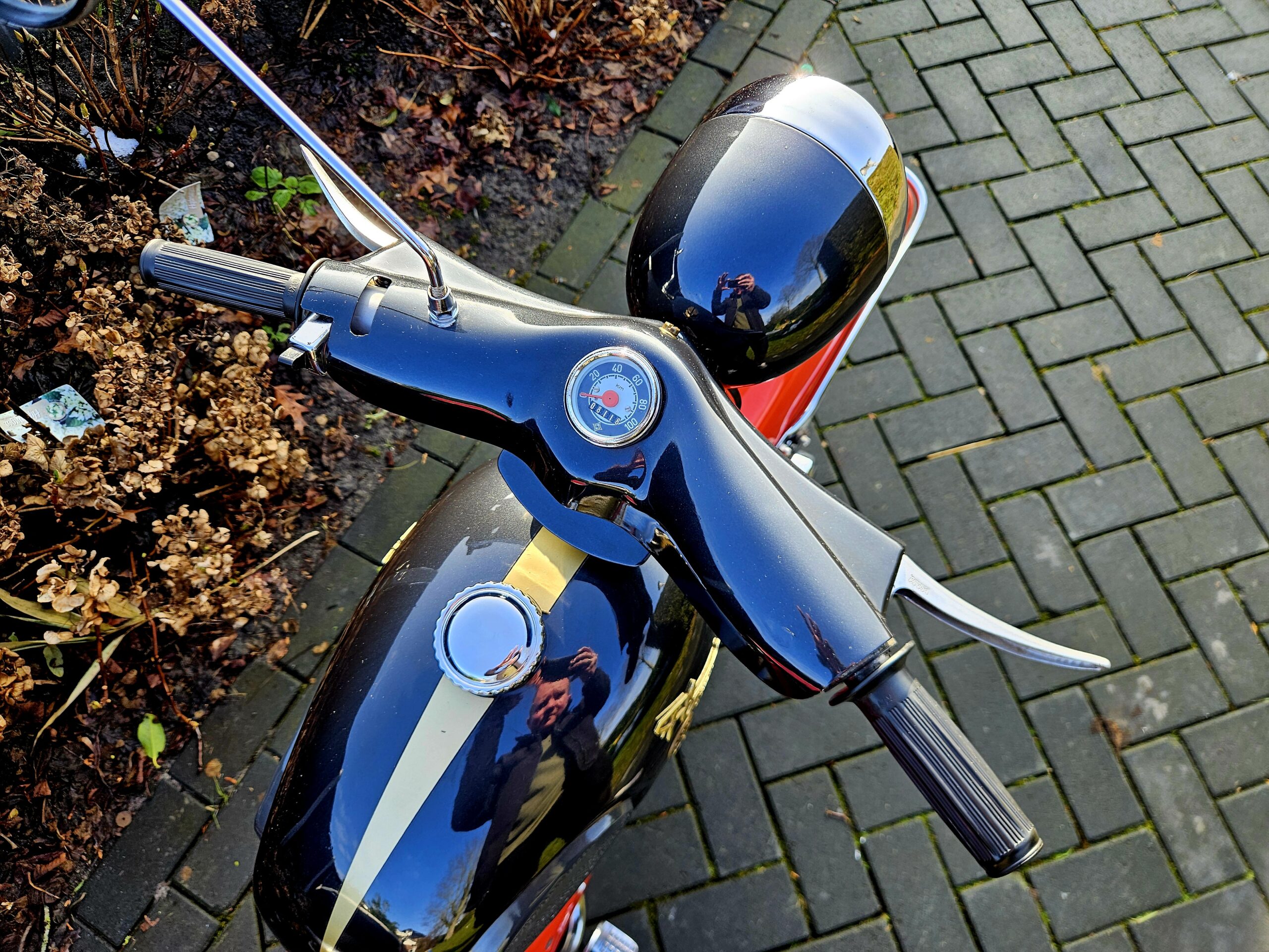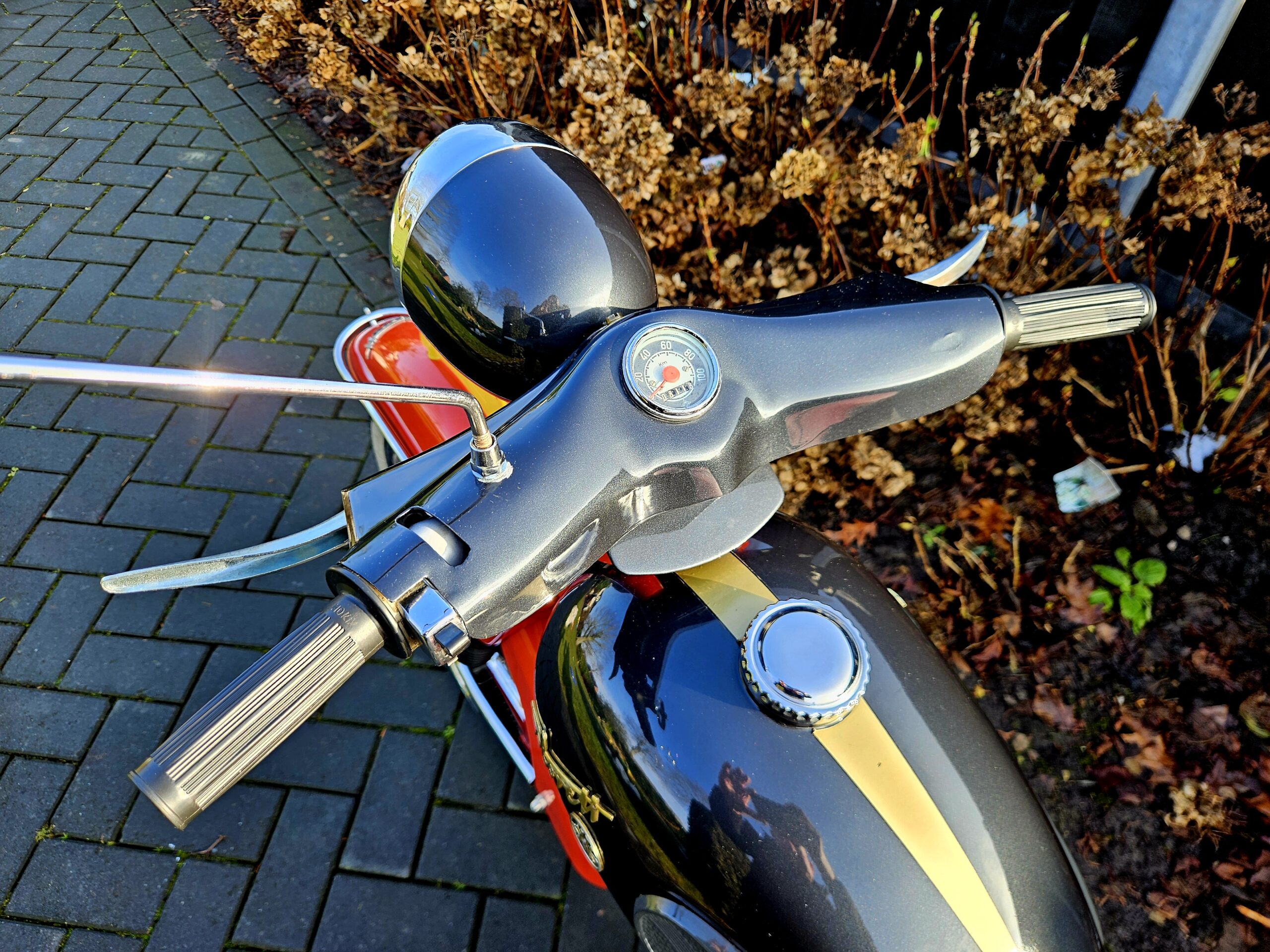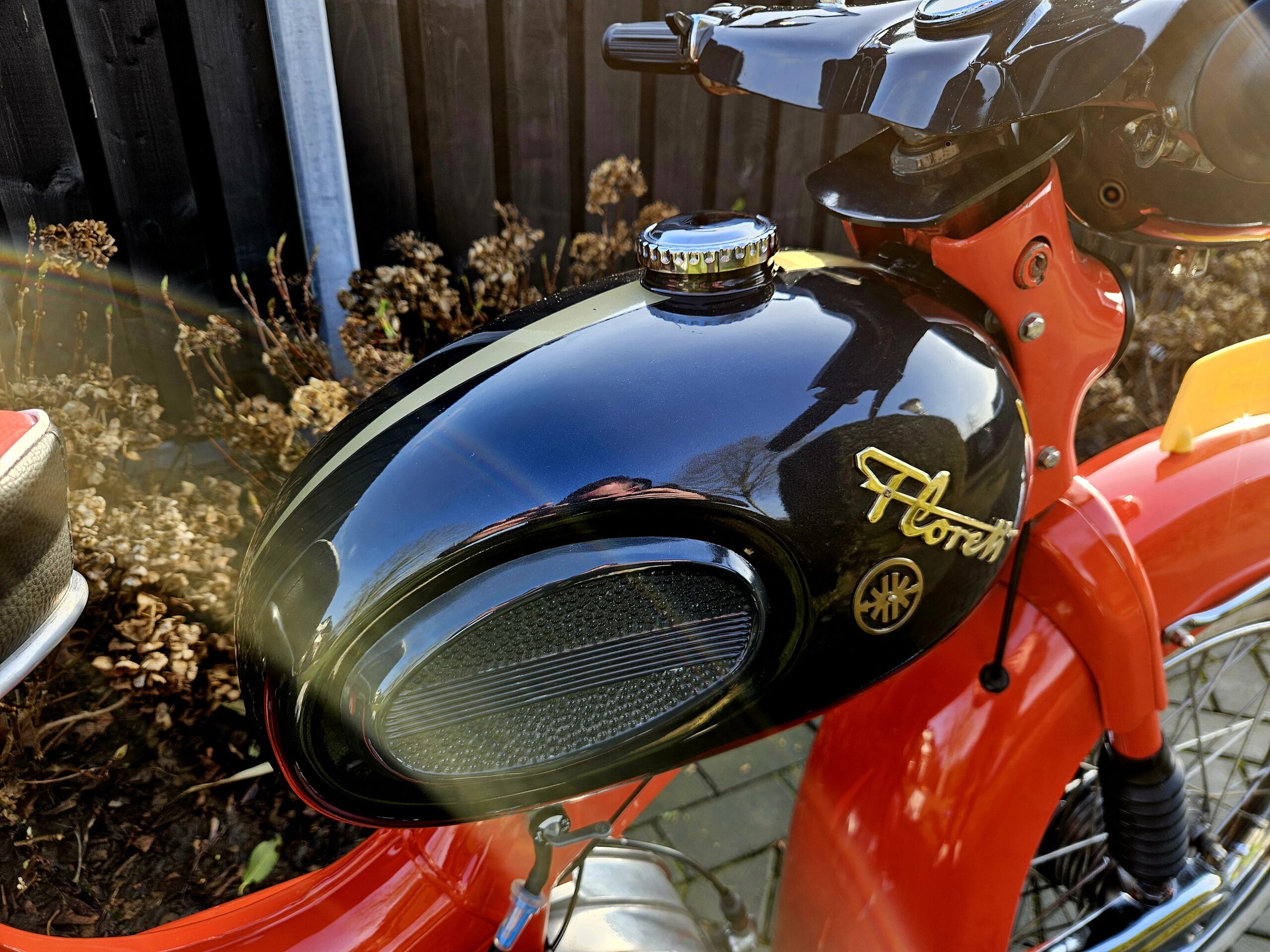 Kreidler Florett Eitank uit 1965. Het betreft een oudere restauratie die er nog zeer goed uitziet. Voorzien van een gereviseerde 3-bak voetgeschakeld en een nieuwe cilinder en zuiger. Lekker touren op dit stukje nostalgie uit de jaren ’60 of gewoon in de woonkamer zetten, want daar is hij echt mooi genoeg voor.