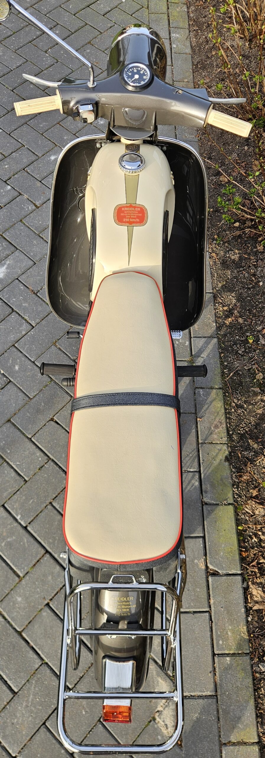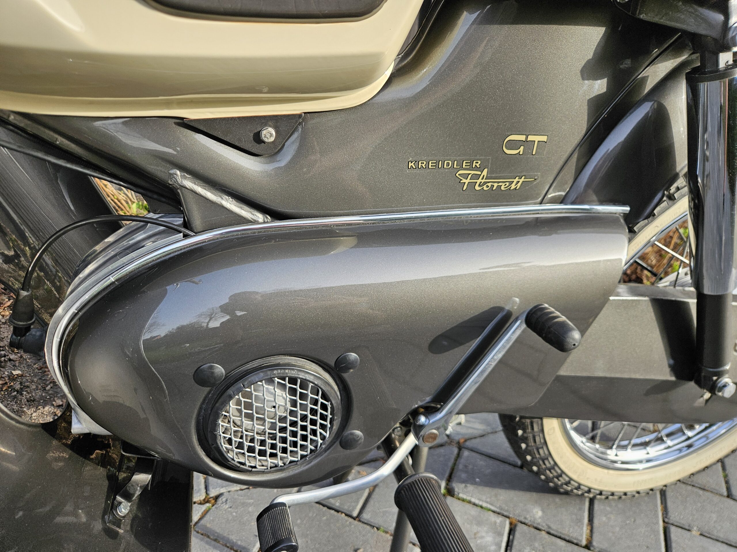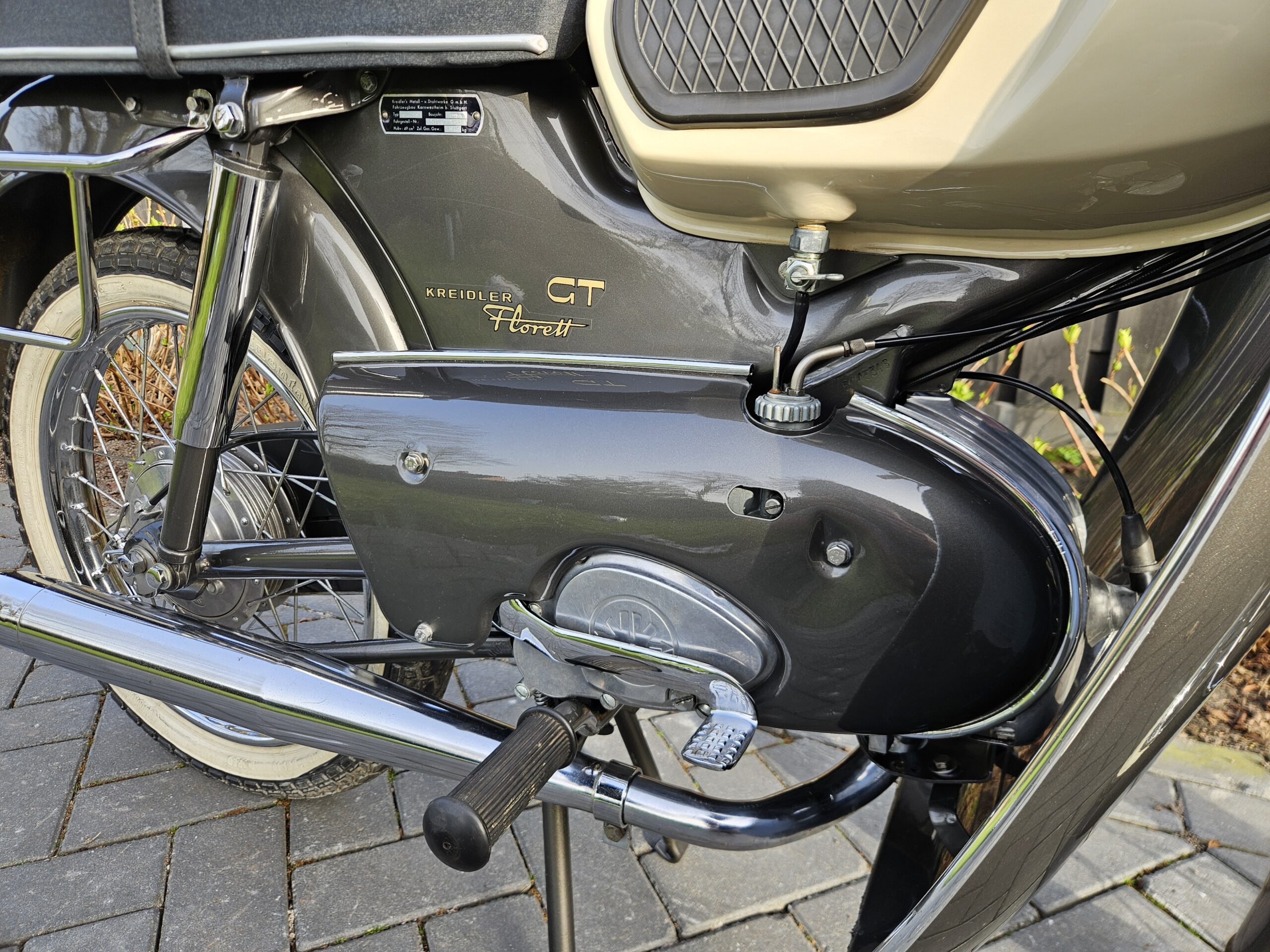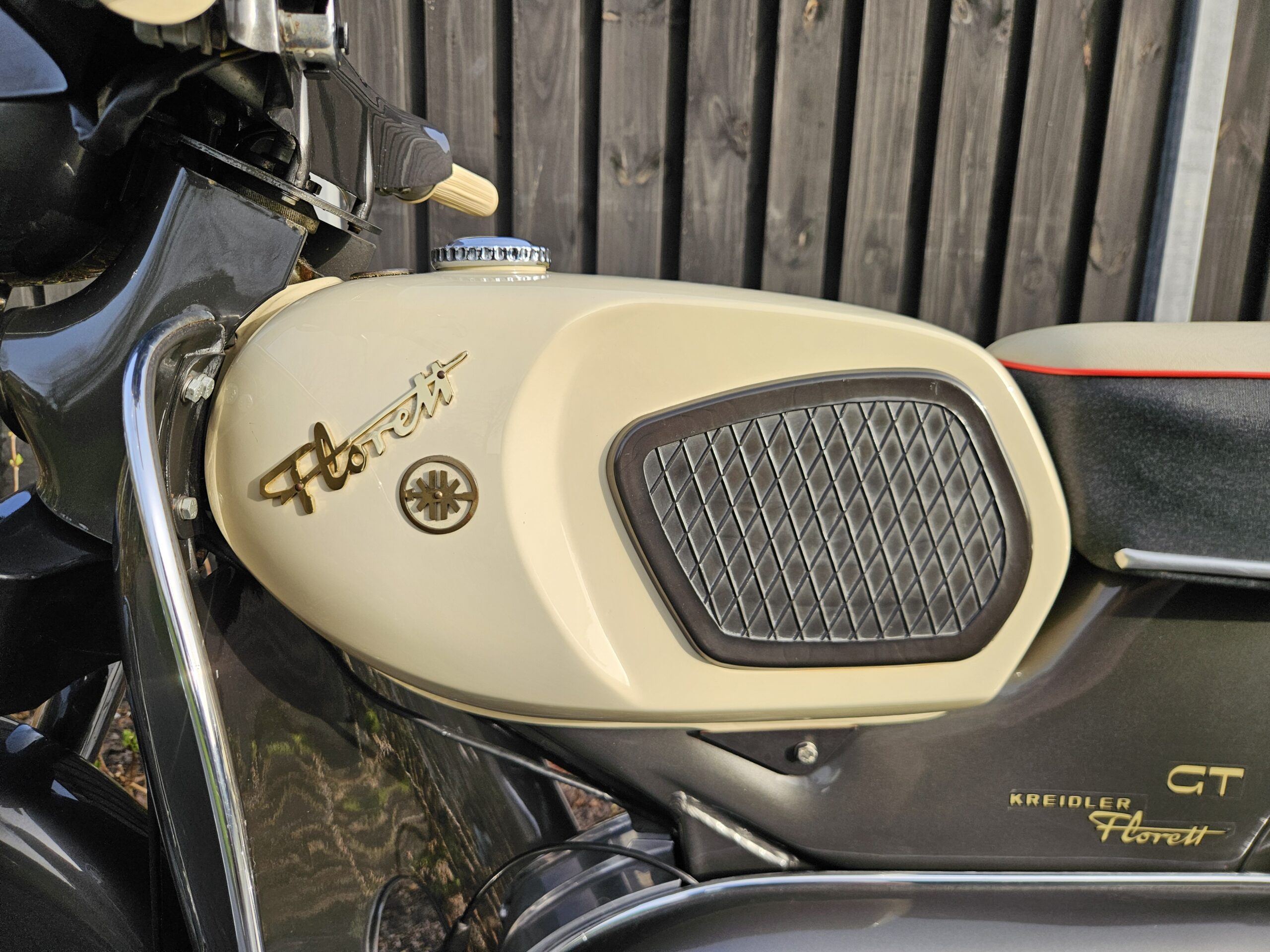 Absoluut één van de mooist gerestaureerde Kreidlers die we voorbij hebben zien komen. Deze Kreidler Florett GT (K54/51) verkeert optisch en technisch in hele bijzondere staat. Kloppend met de originele 5-indirect motor loopt, 5,2 pk Mahle cilinder en de juiste 18mm BING carburateur. De grote Campagnolo remnaven komen van een RS (jongere broer) maar zijn een hele mooie toevoeging aan deze classic.