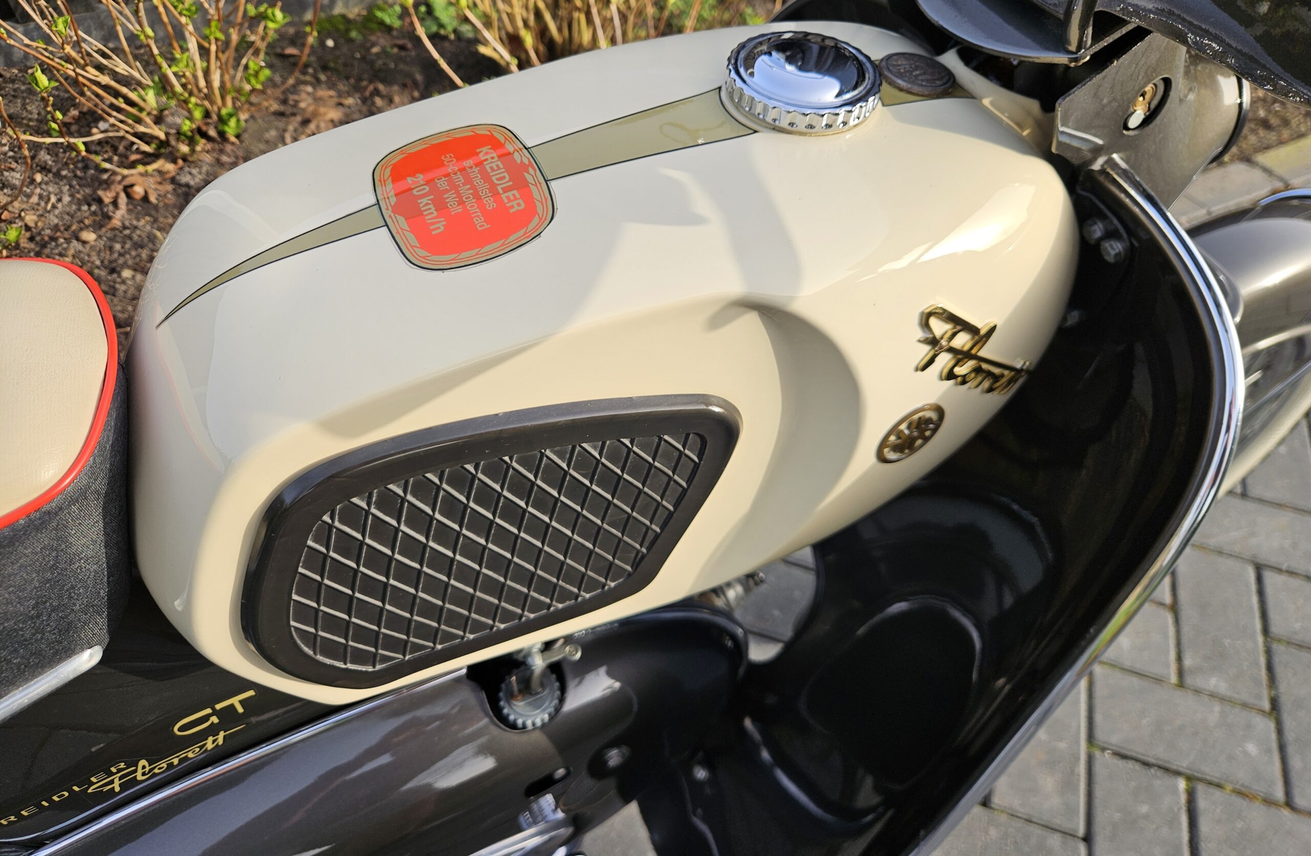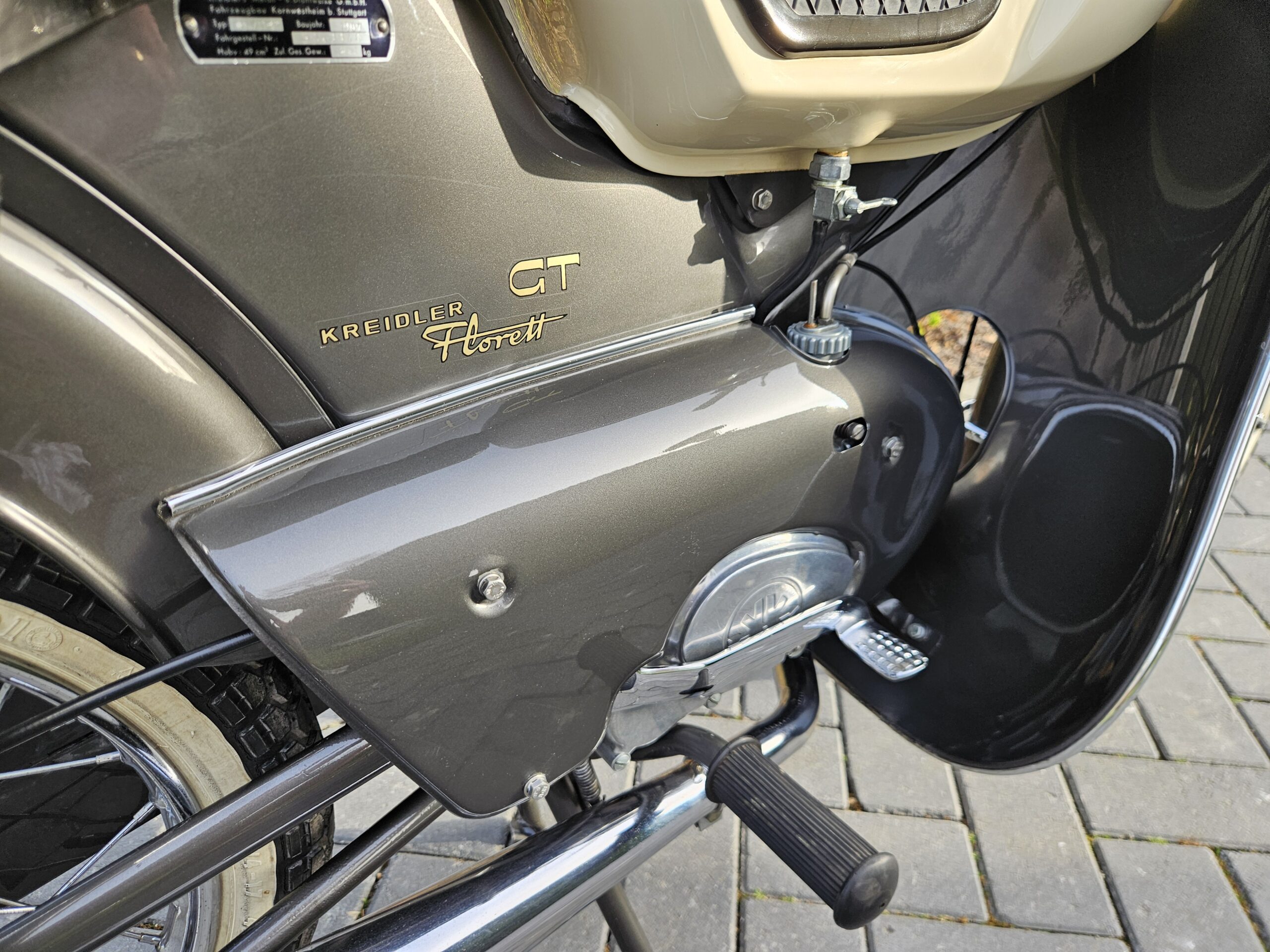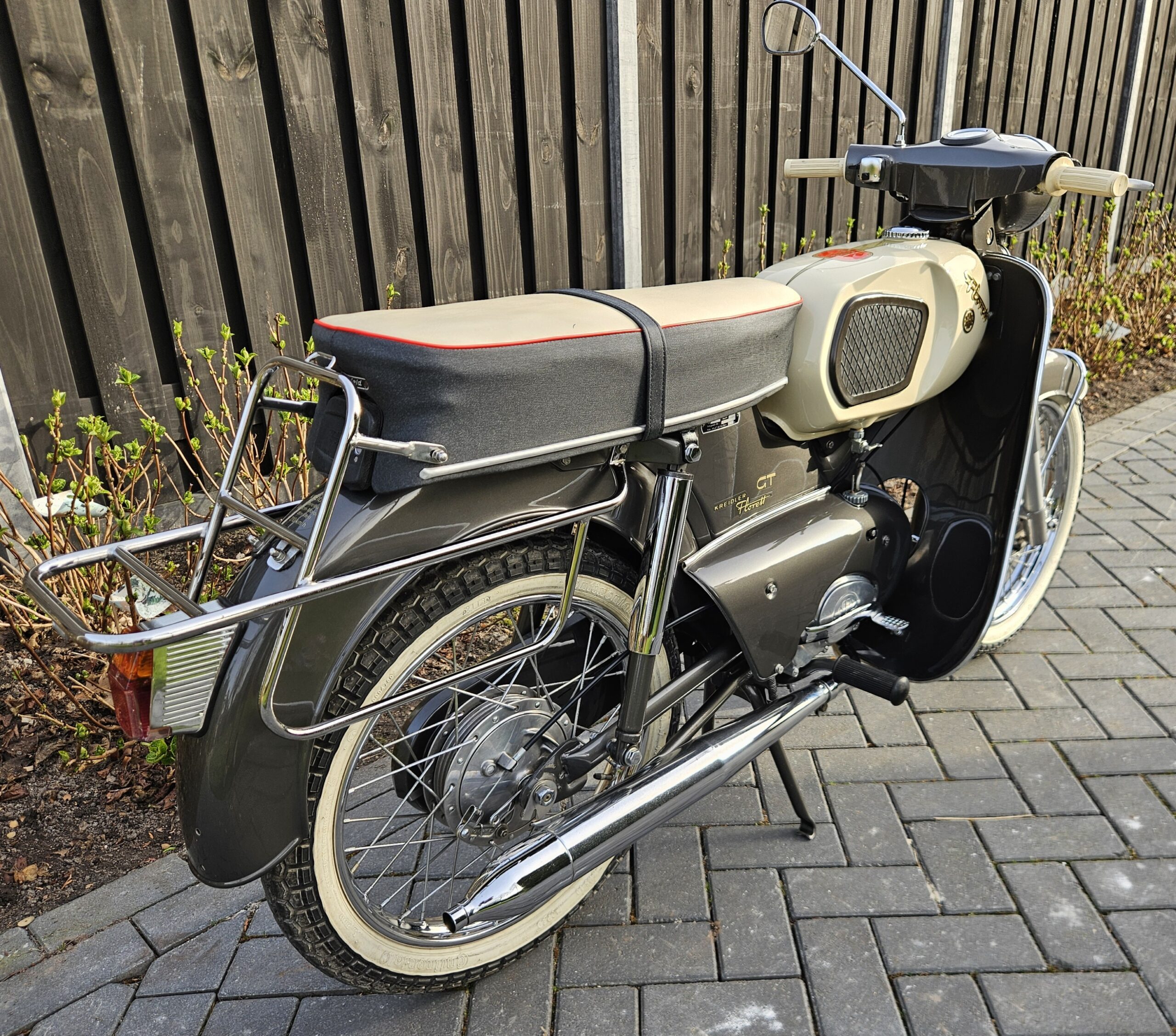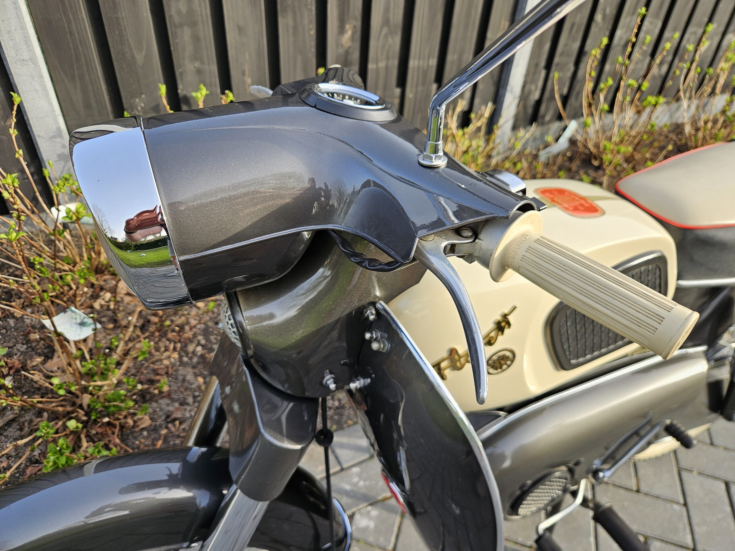 Absoluut één van de mooist gerestaureerde Kreidlers die we voorbij hebben zien komen. Deze Kreidler Florett GT (K54/51) verkeert optisch en technisch in hele bijzondere staat. Kloppend met de originele 5-indirect motor loopt, 5,2 pk Mahle cilinder en de juiste 18mm BING carburateur. De grote Campagnolo remnaven komen van een RS (jongere broer) maar zijn een hele mooie toevoeging aan deze classic.