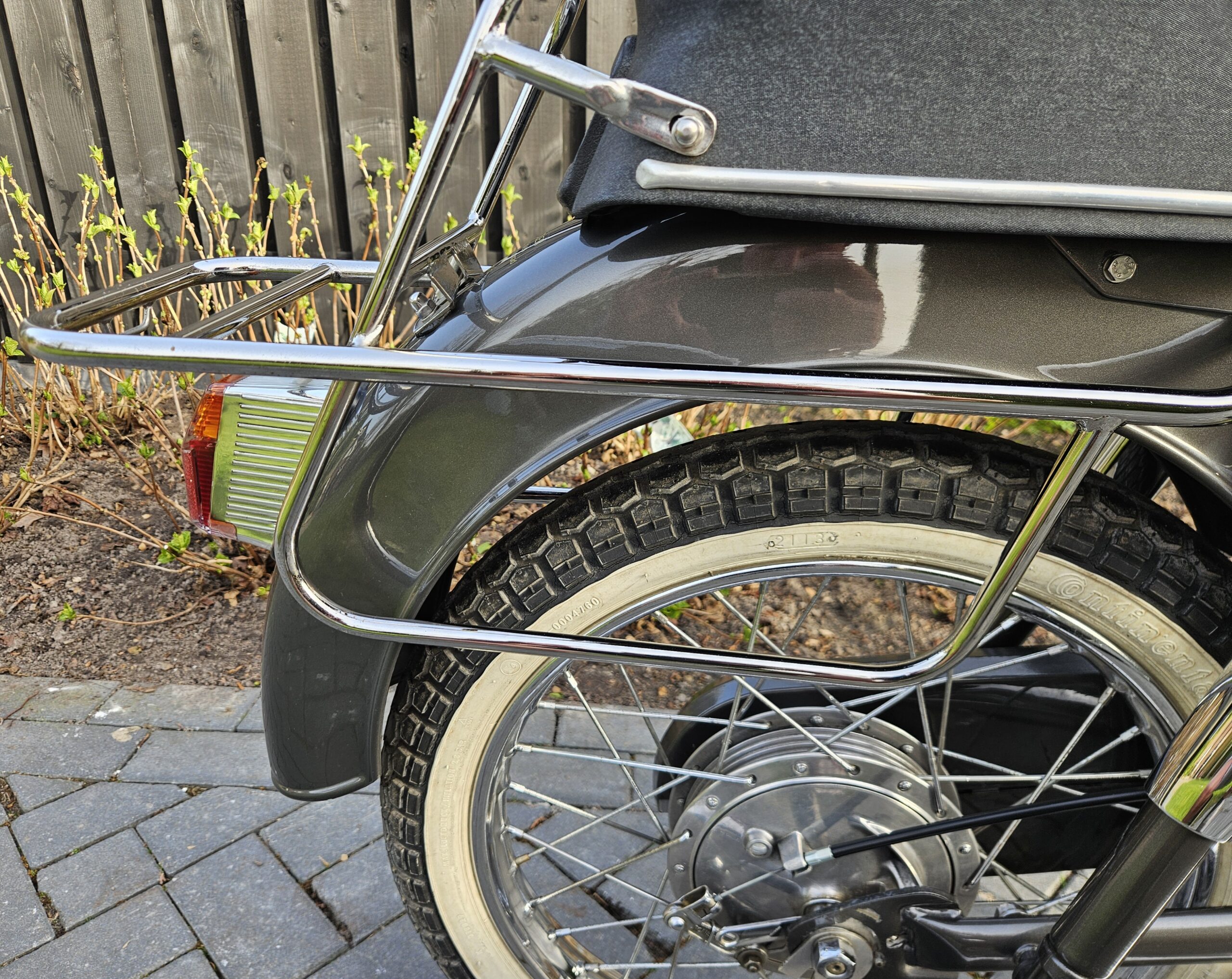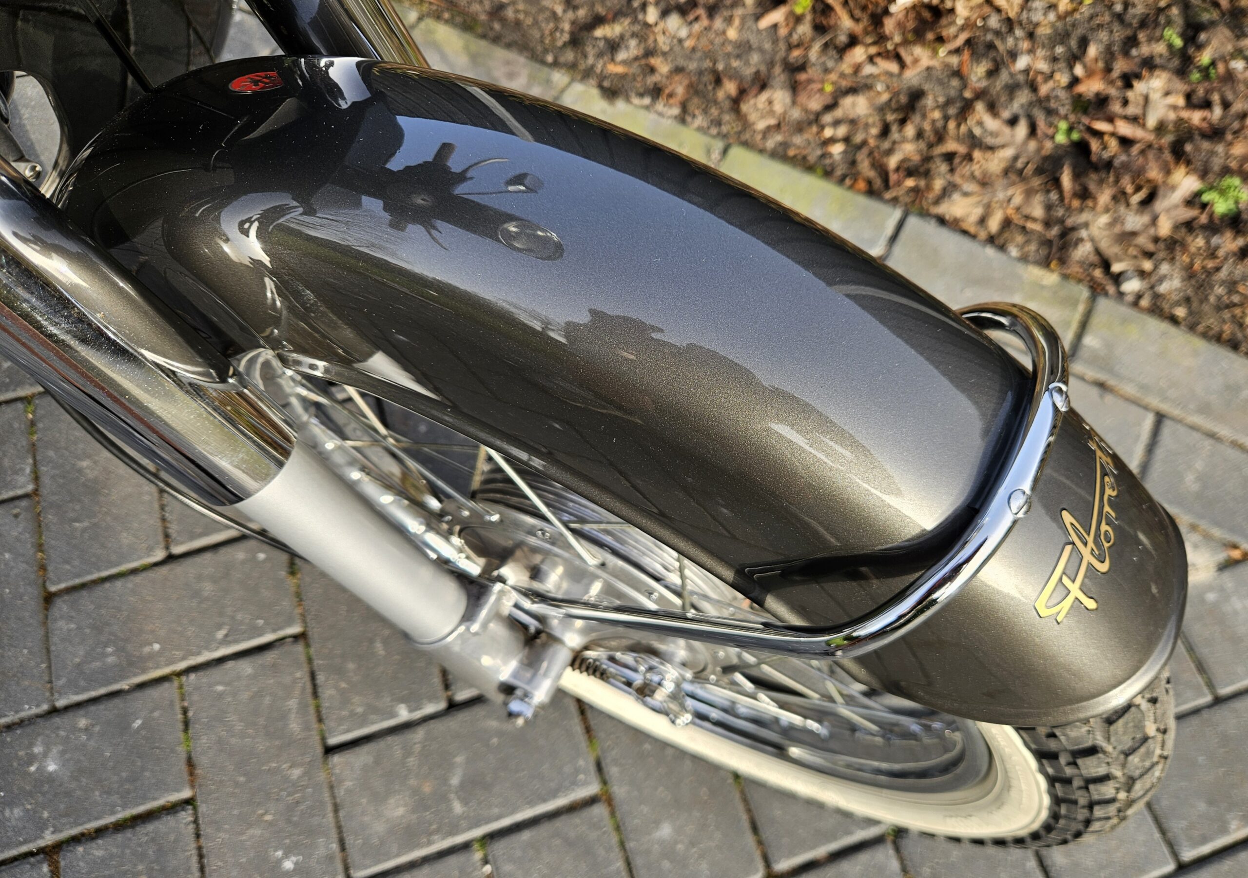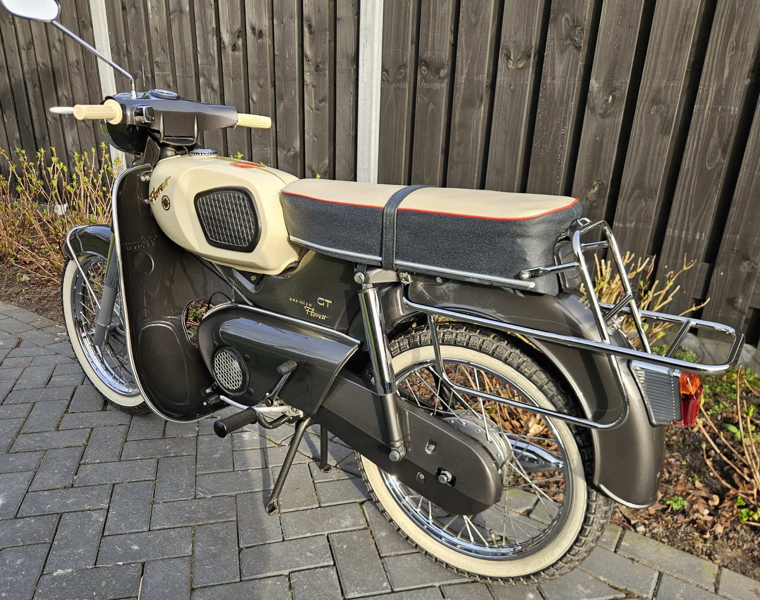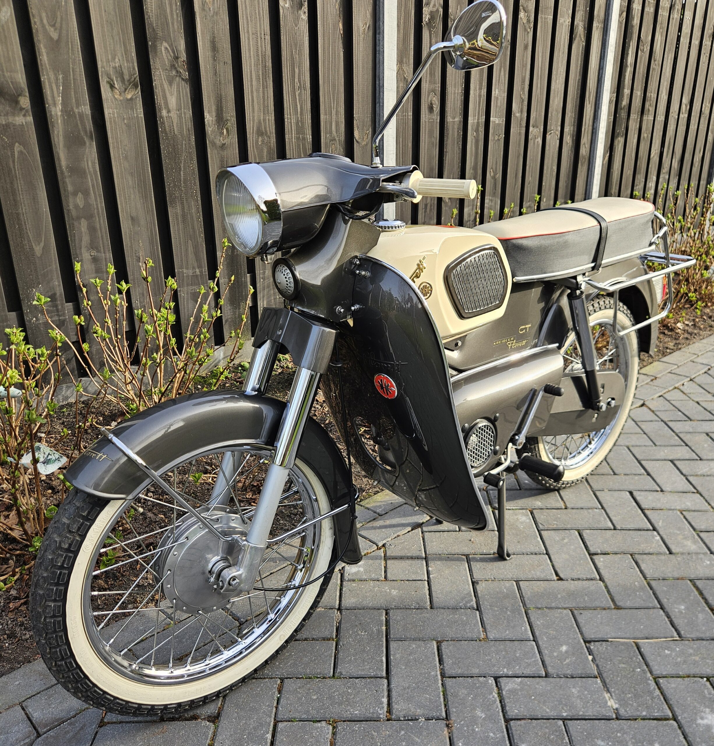 Absoluut één van de mooist gerestaureerde Kreidlers die we voorbij hebben zien komen. Deze Kreidler Florett GT (K54/51) verkeert optisch en technisch in hele bijzondere staat. Kloppend met de originele 5-indirect motor loopt, 5,2 pk Mahle cilinder en de juiste 18mm BING carburateur. De grote Campagnolo remnaven komen van een RS (jongere broer) maar zijn een hele mooie toevoeging aan deze classic.