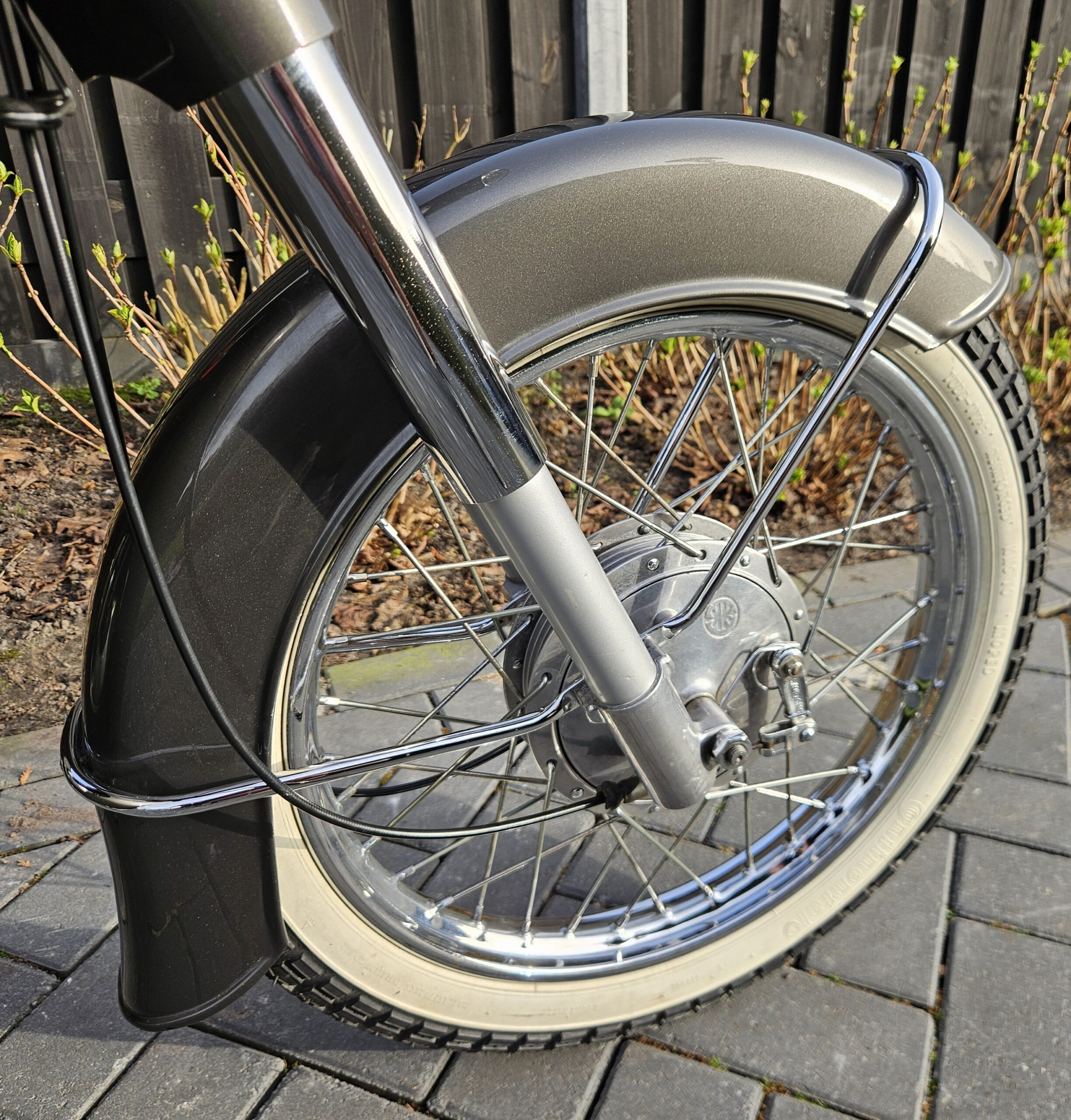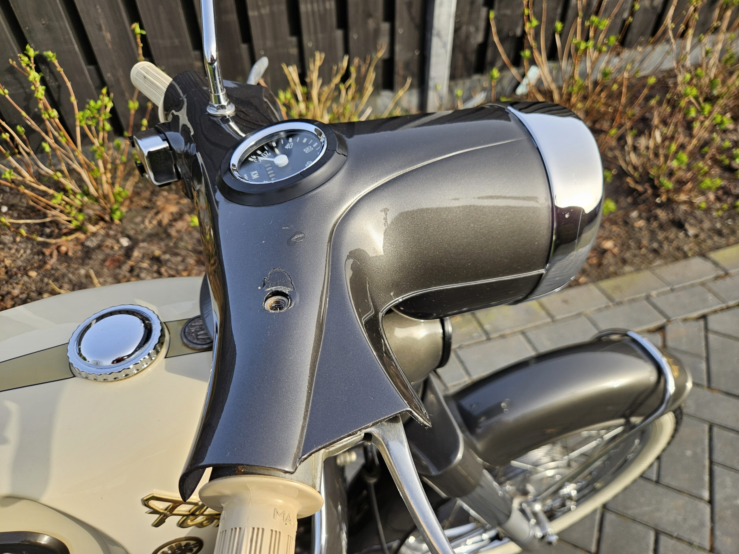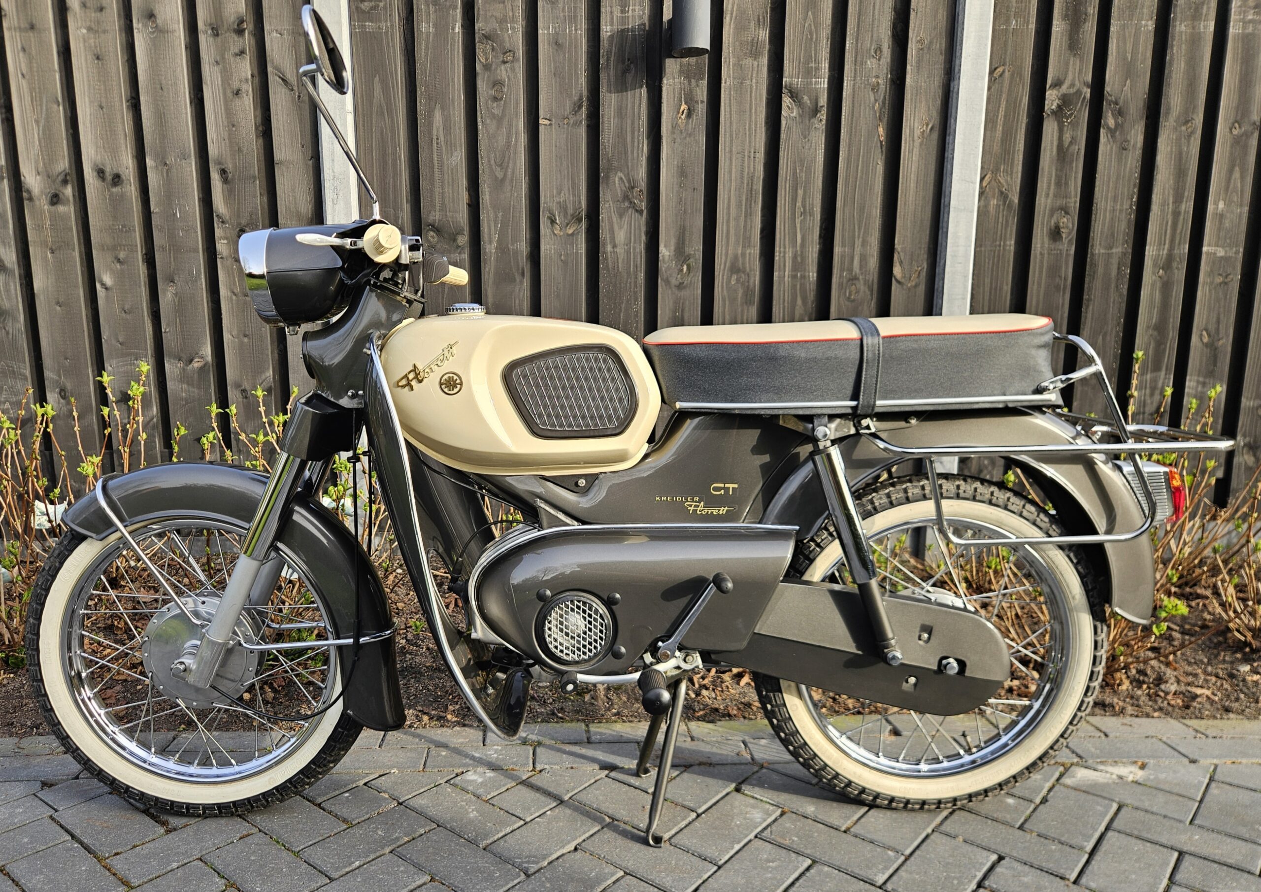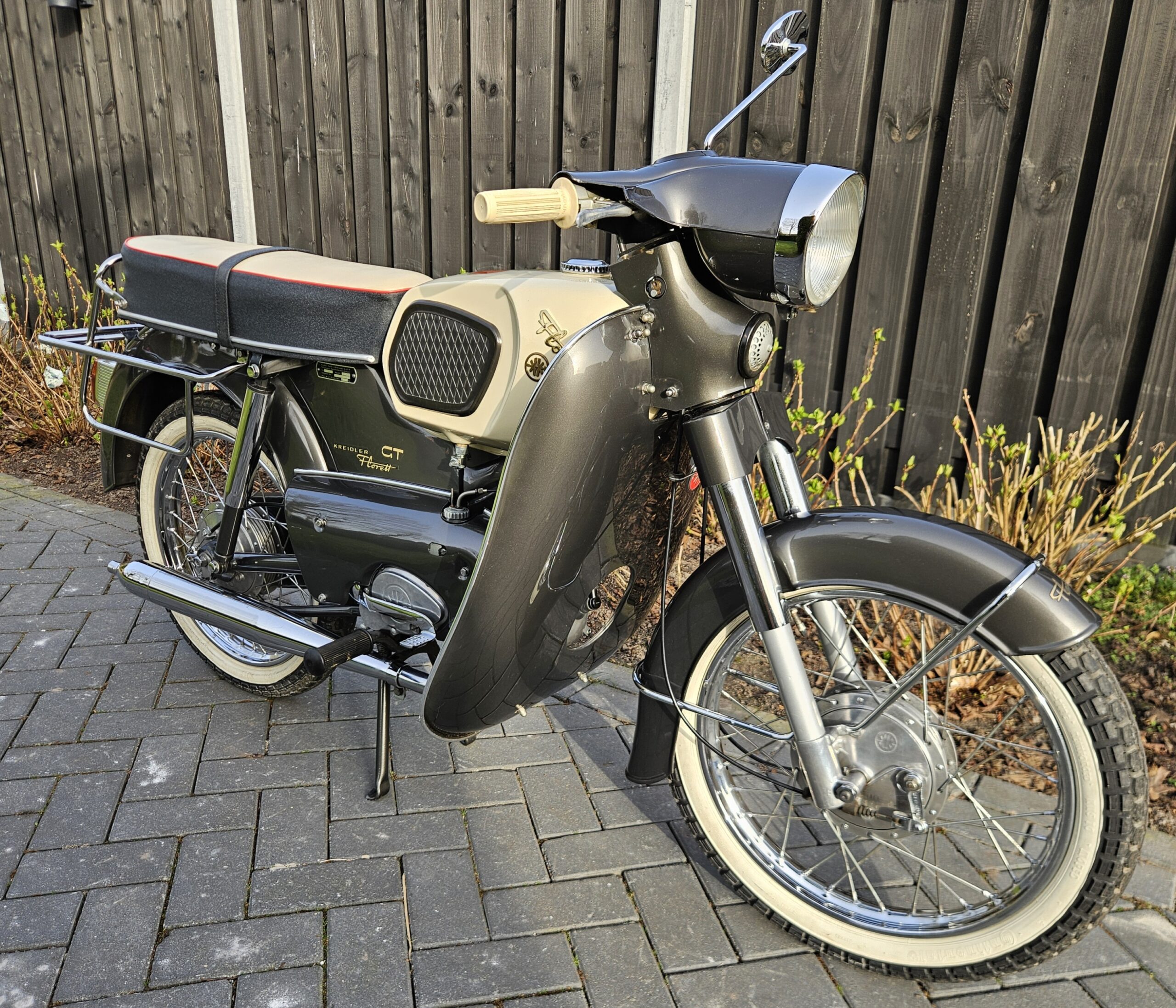 Absoluut één van de mooist gerestaureerde Kreidlers die we voorbij hebben zien komen. Deze Kreidler Florett GT (K54/51) verkeert optisch en technisch in hele bijzondere staat. Kloppend met de originele 5-indirect motor loopt, 5,2 pk Mahle cilinder en de juiste 18mm BING carburateur. De grote Campagnolo remnaven komen van een RS (jongere broer) maar zijn een hele mooie toevoeging aan deze classic.