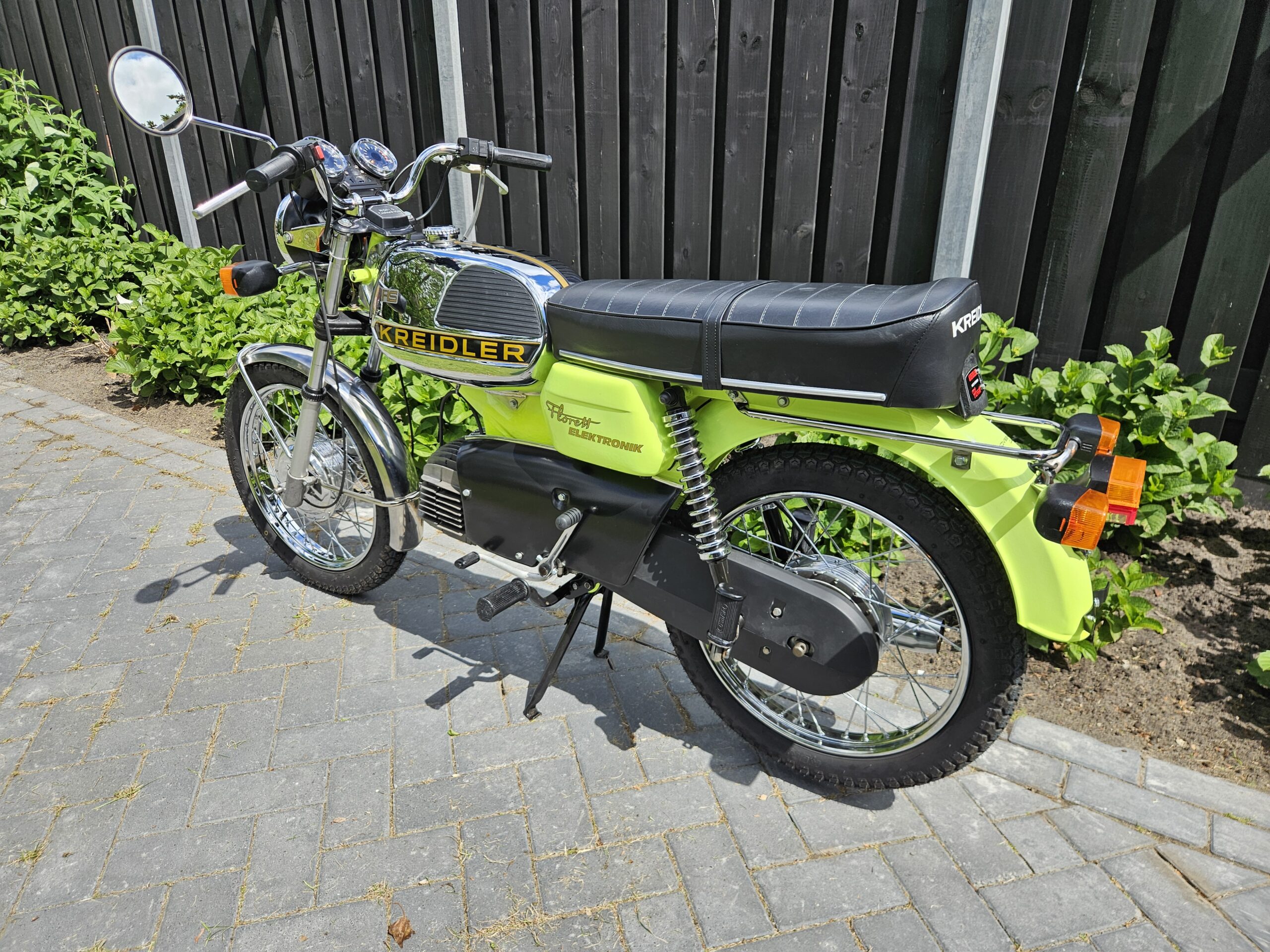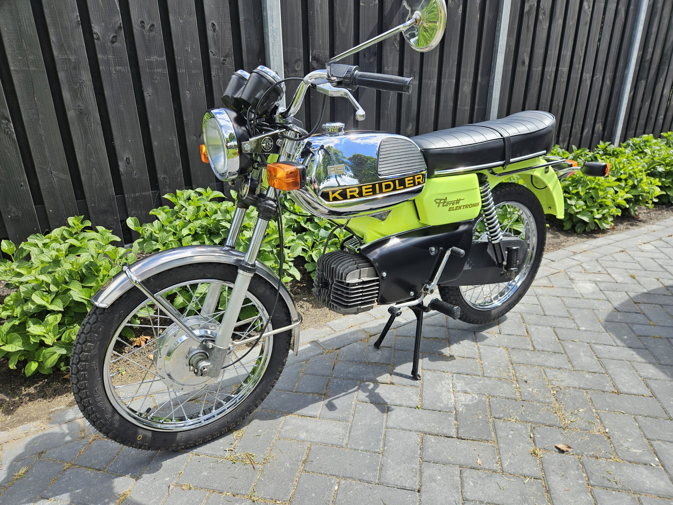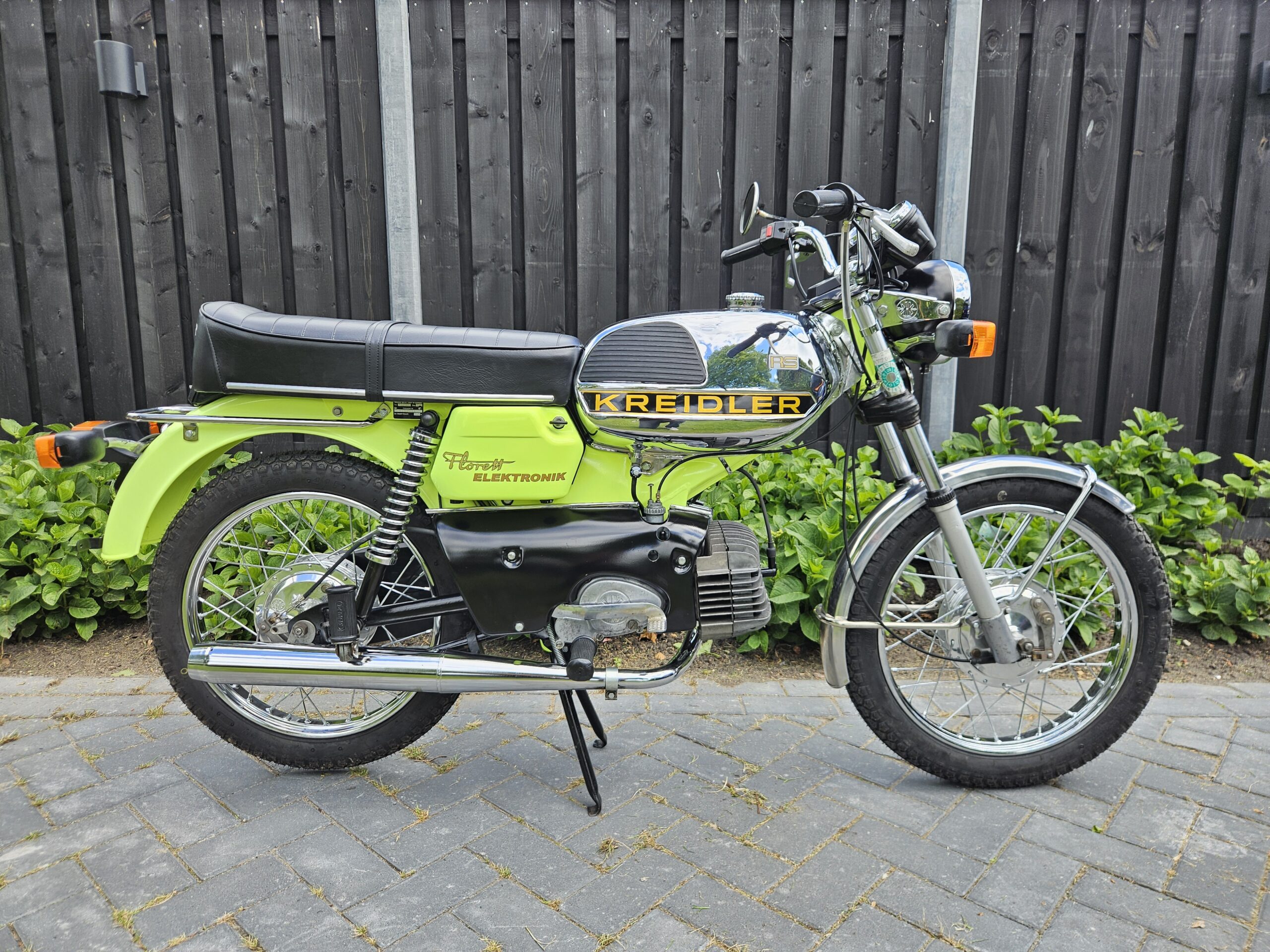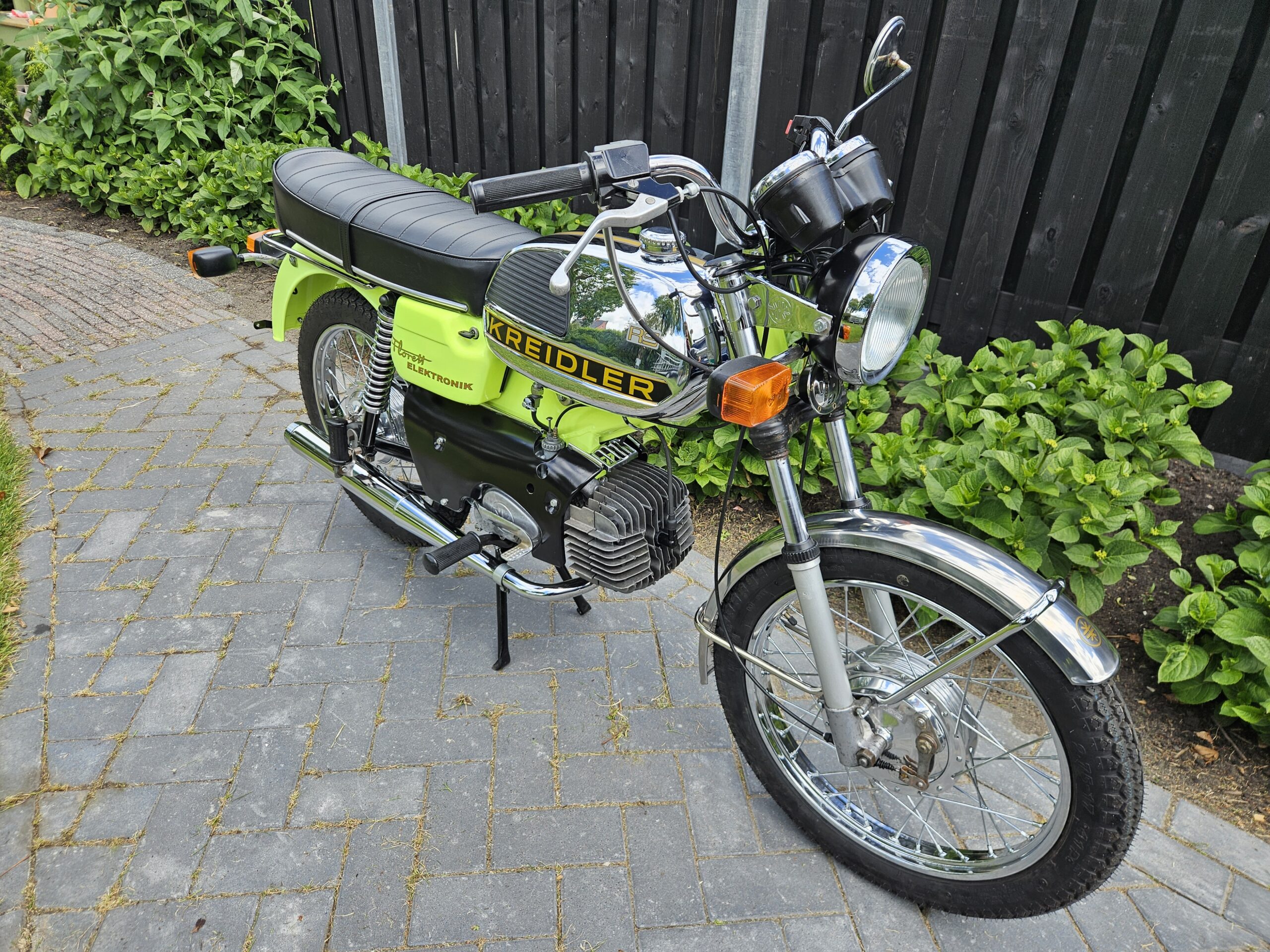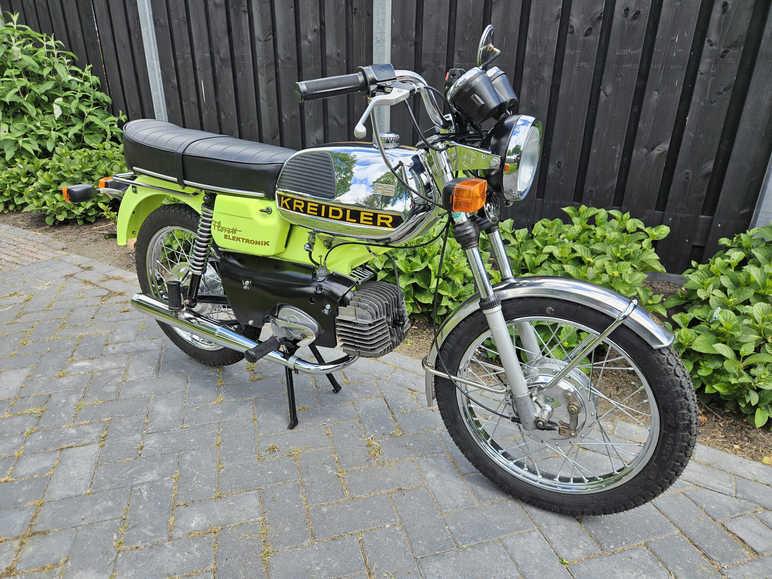 Een echte blikvanger deze Kreidler Florett RS uit 1975 in zijn fluorgele kleur. De volledige typebenaming is RSH-B, waarbij de B- staat voor Blinkanlage en de H- voor Hochlenker. Dit was een van de eerste types RS met het direct geschakelde 5-bak blok.