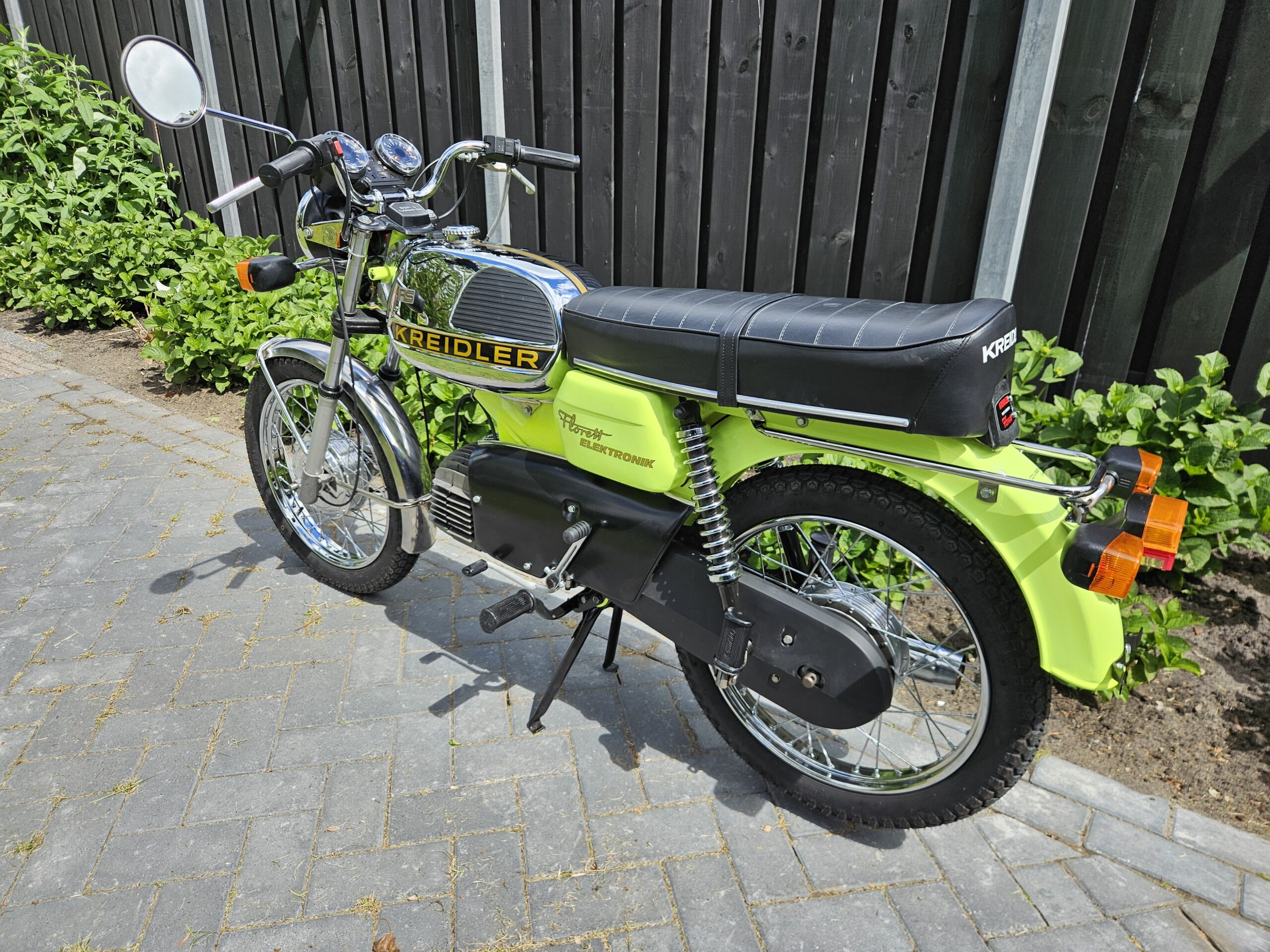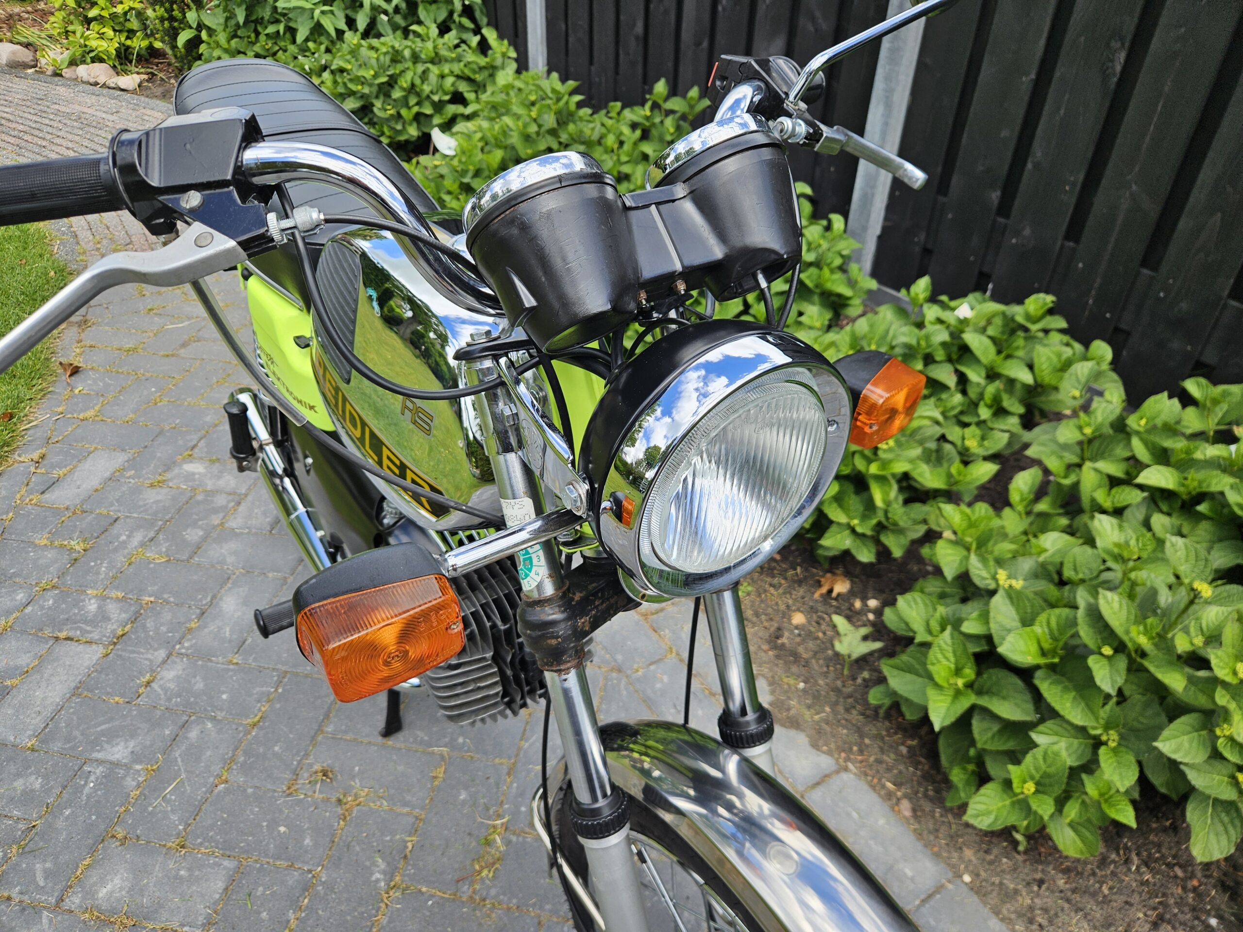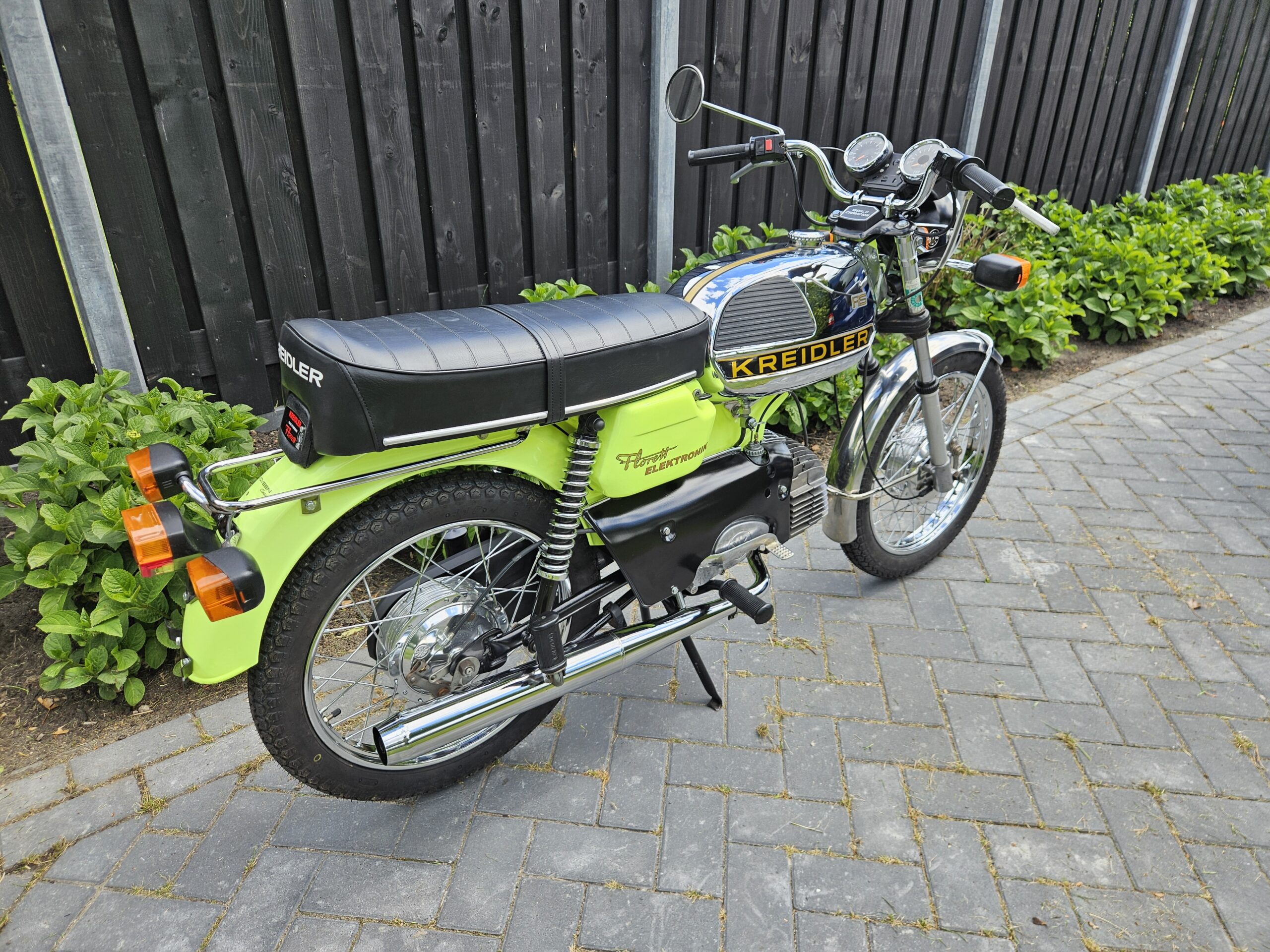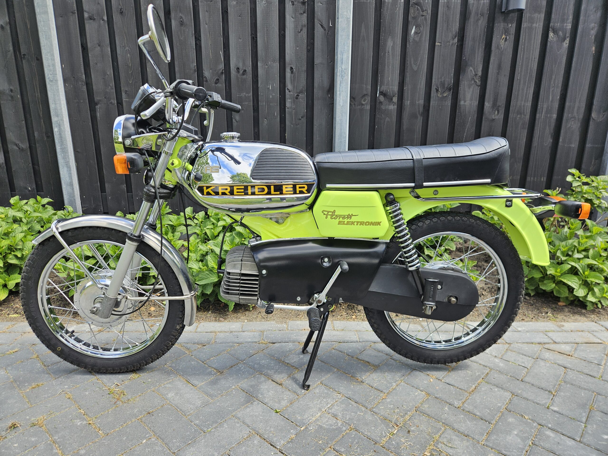 Een echte blikvanger deze Kreidler Florett RS uit 1975 in zijn fluorgele kleur. De volledige typebenaming is RSH-B, waarbij de B- staat voor Blinkanlage en de H- voor Hochlenker. Dit was een van de eerste types RS met het direct geschakelde 5-bak blok.