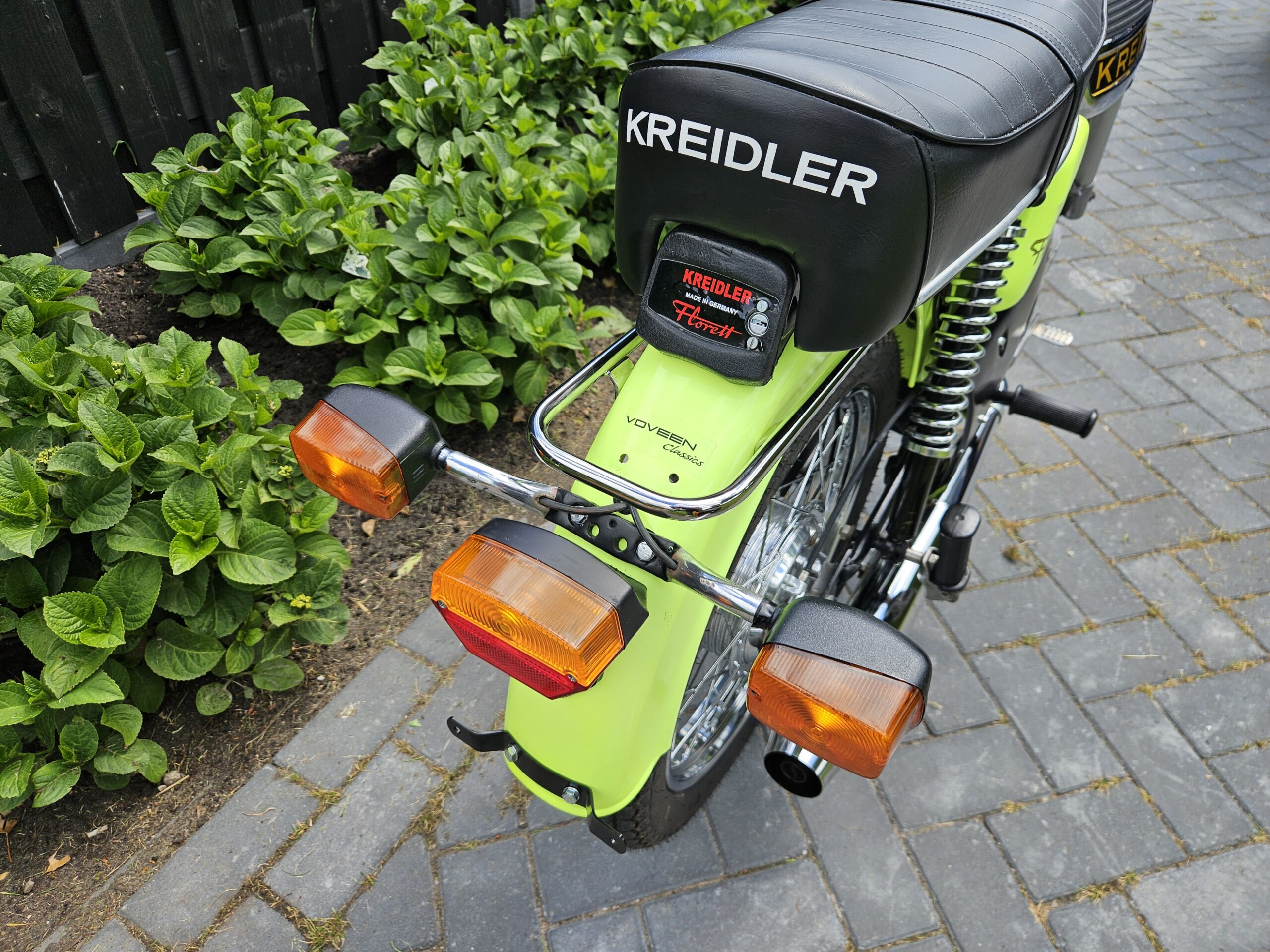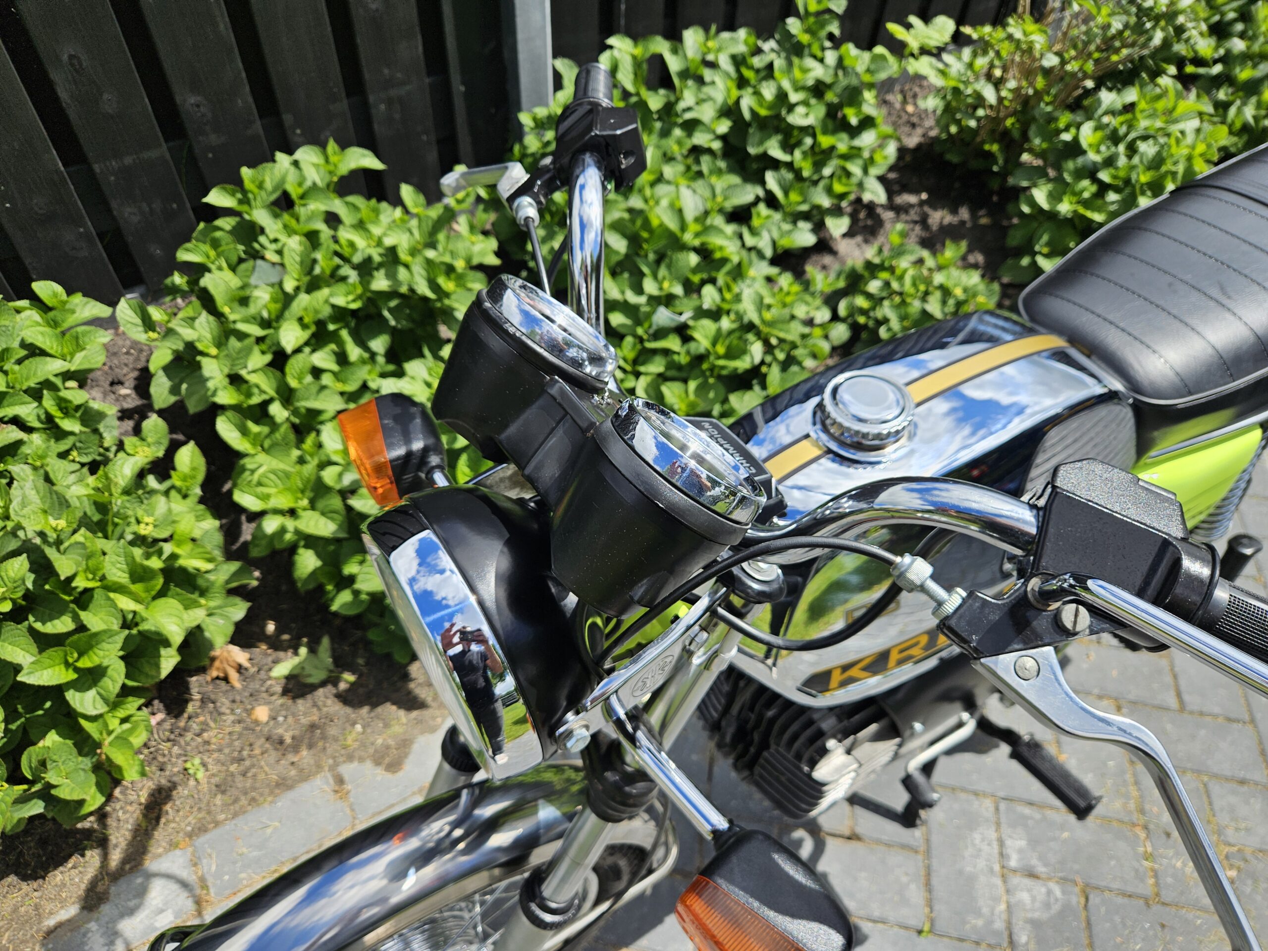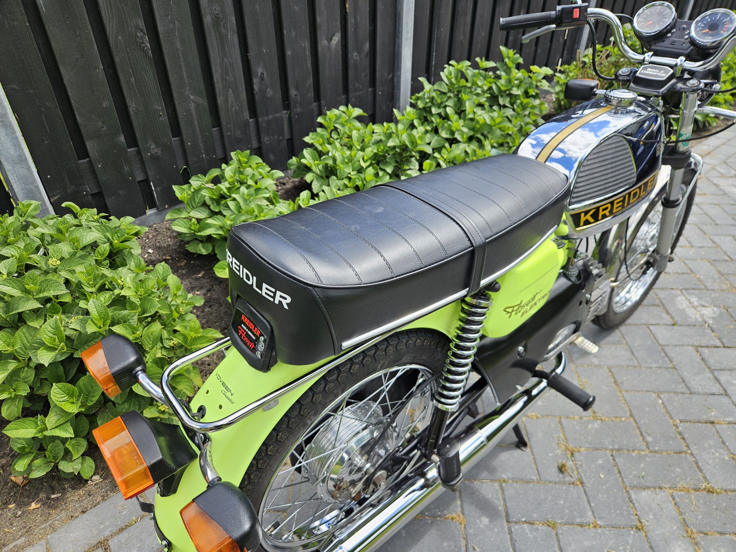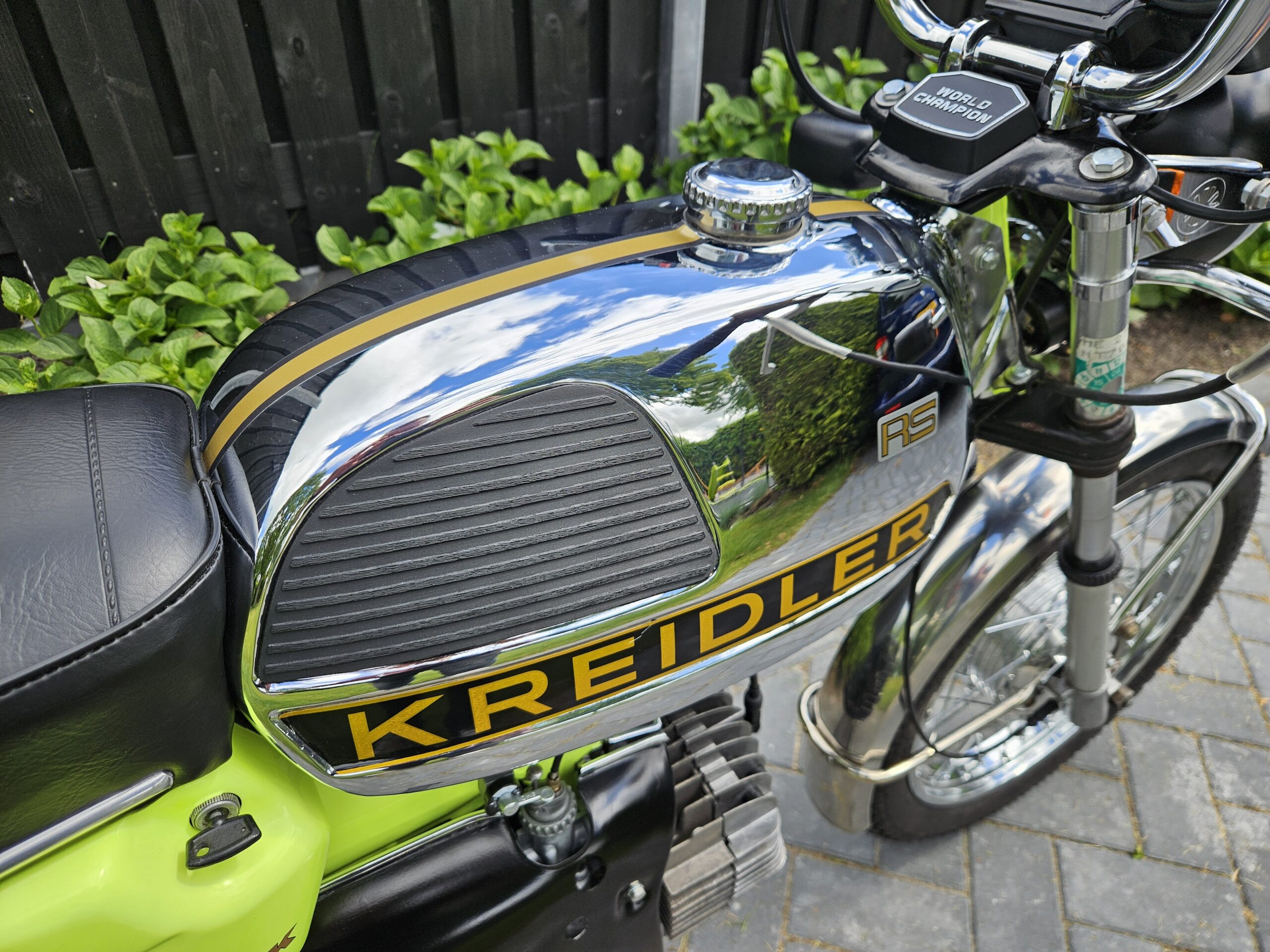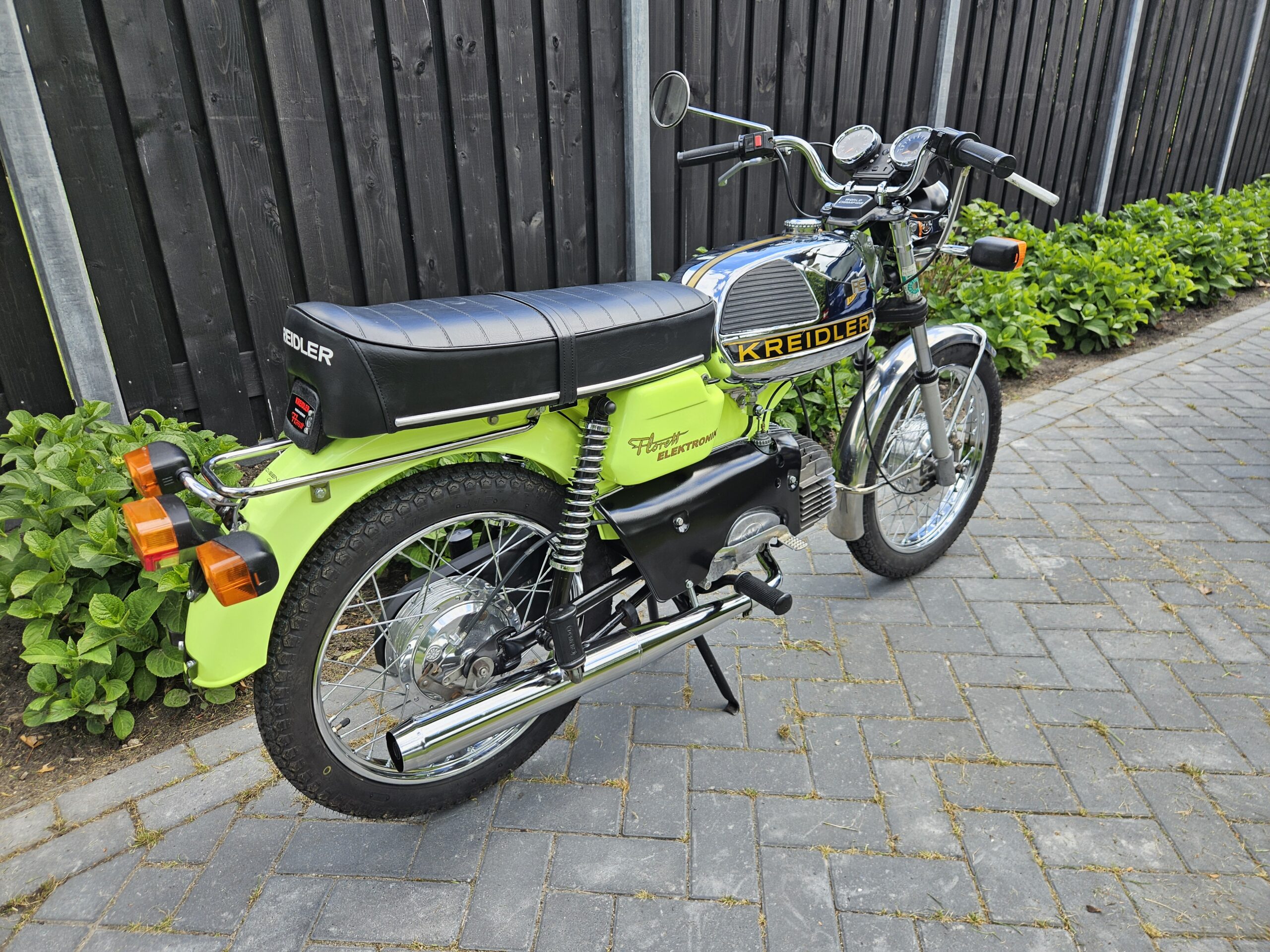 Een echte blikvanger deze Kreidler Florett RS uit 1975 in zijn fluorgele kleur. De volledige typebenaming is RSH-B, waarbij de B- staat voor Blinkanlage en de H- voor Hochlenker. Dit was een van de eerste types RS met het direct geschakelde 5-bak blok.