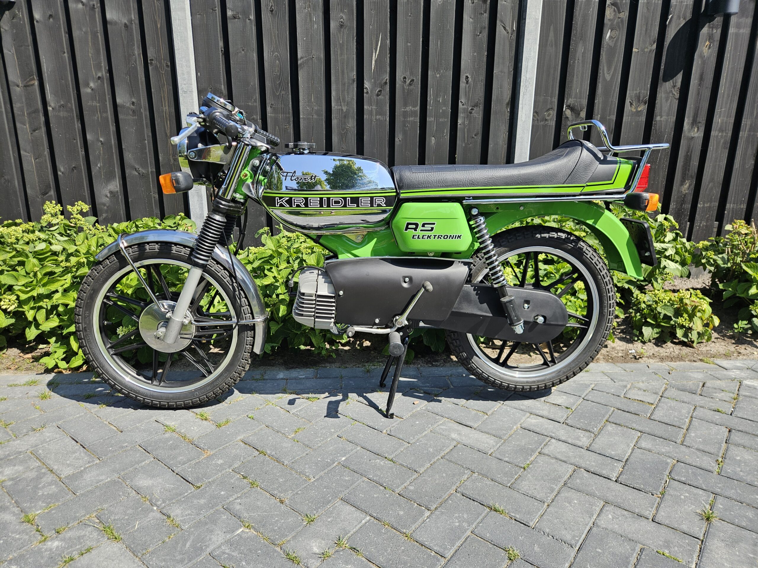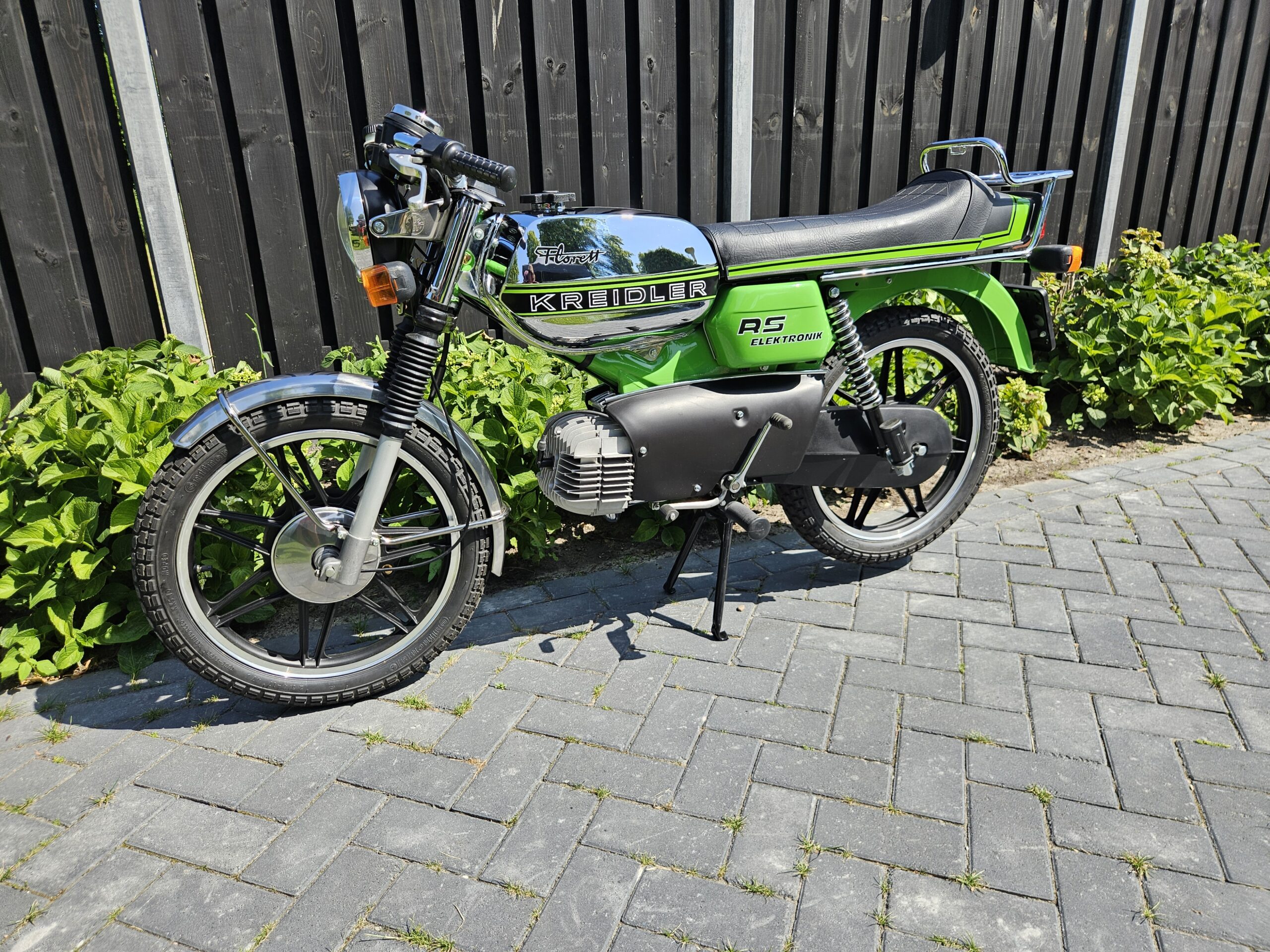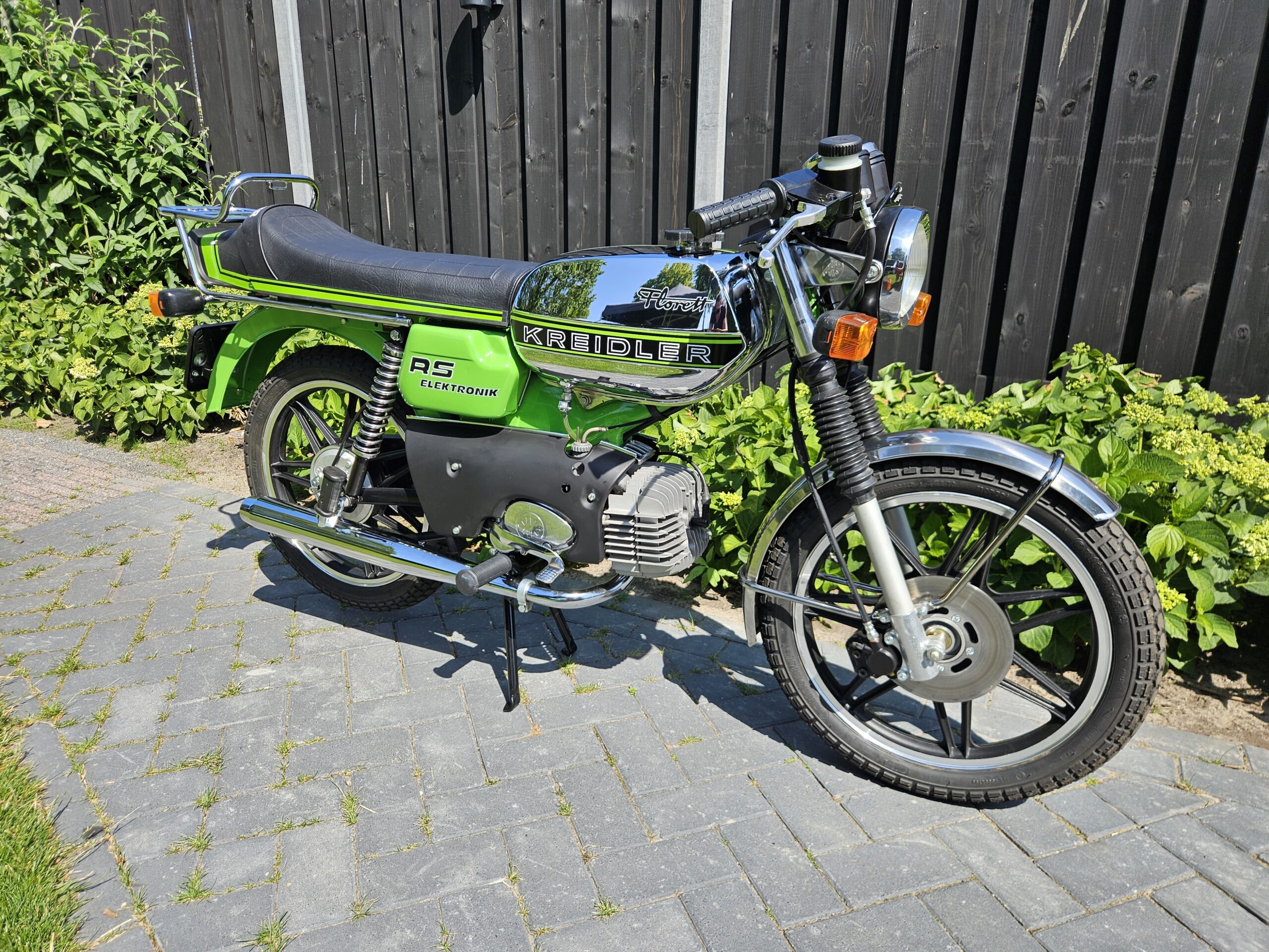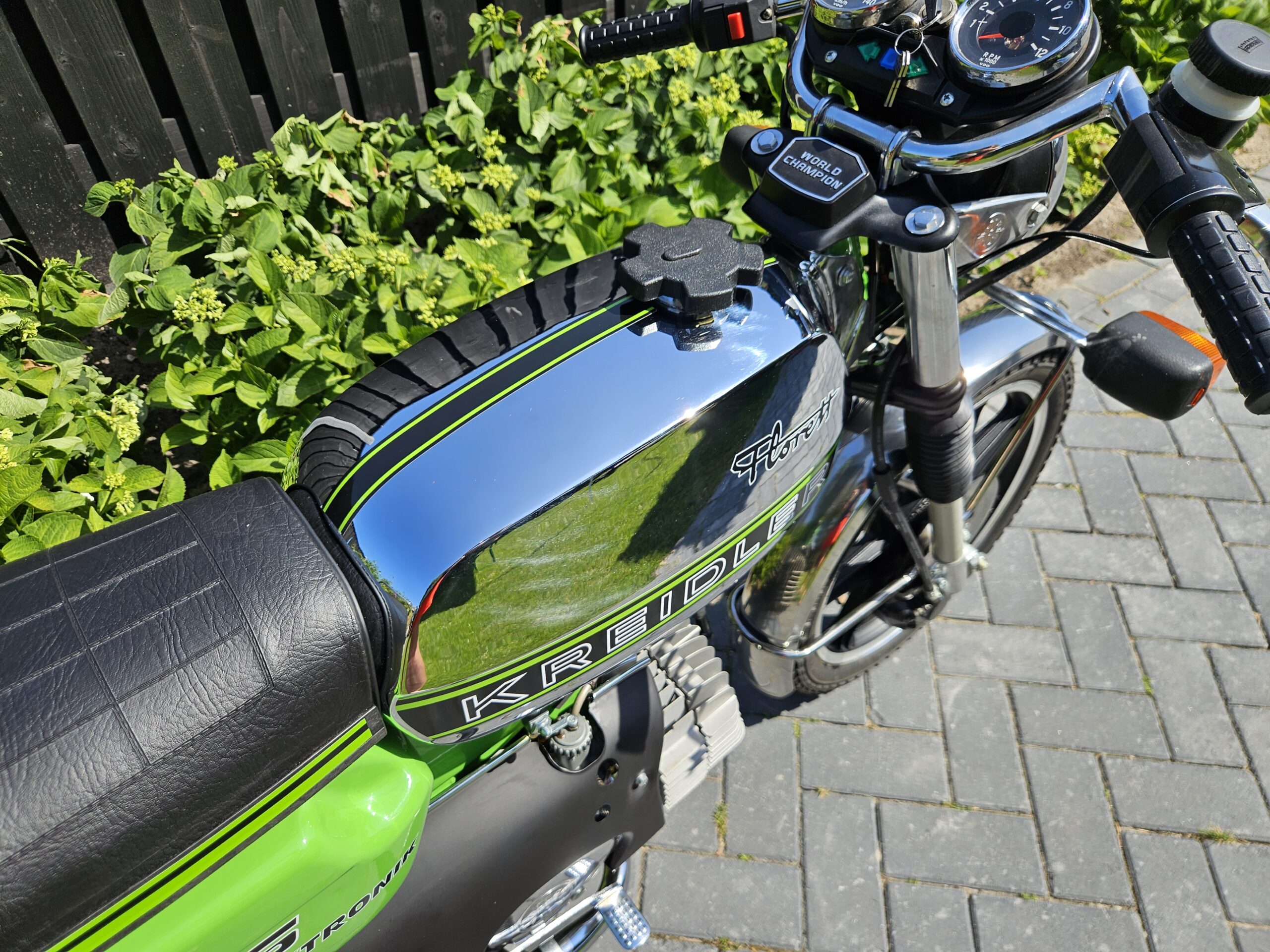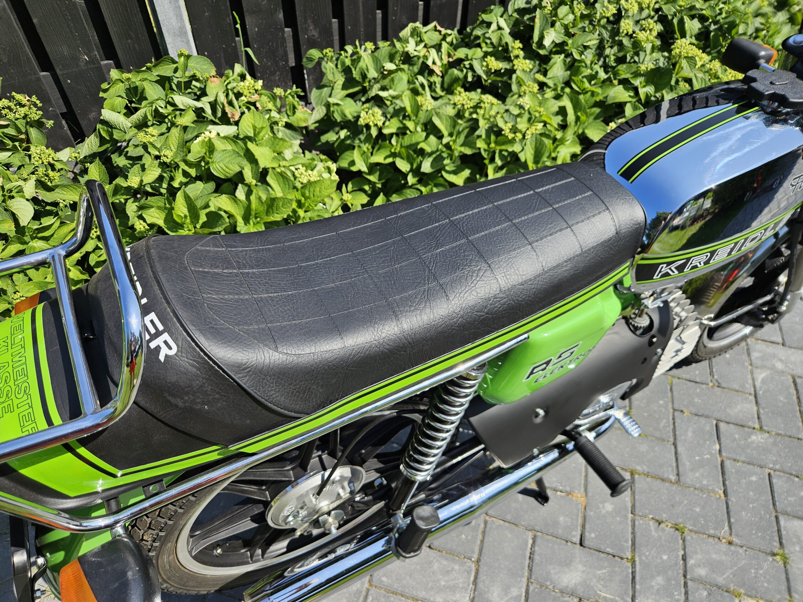 Deze Kreidler Florett RS-GS uit 1978 heeft namelijk nog maar 13 km op de teller na een volledige restauratie van hoge kwaliteit. Opgebouwd op een origineel Golfgrun RS frame (CH K54/511), maar gekeurd als bromfiets. De directe 5-bak motor loopt zoals het hoort en is helemaal gereviseerd. Prachtig om weg te zetten of om lekker mee te touren.