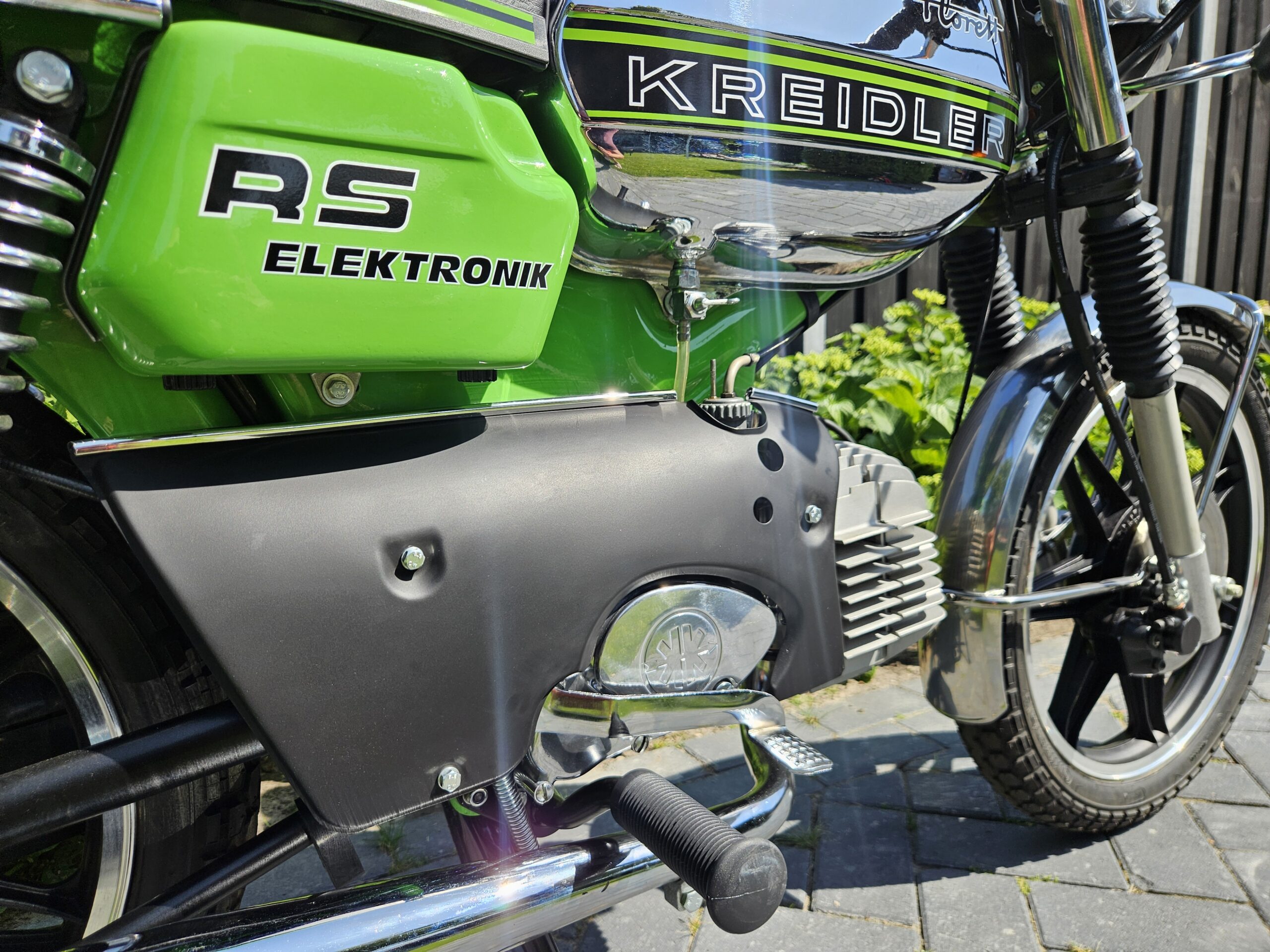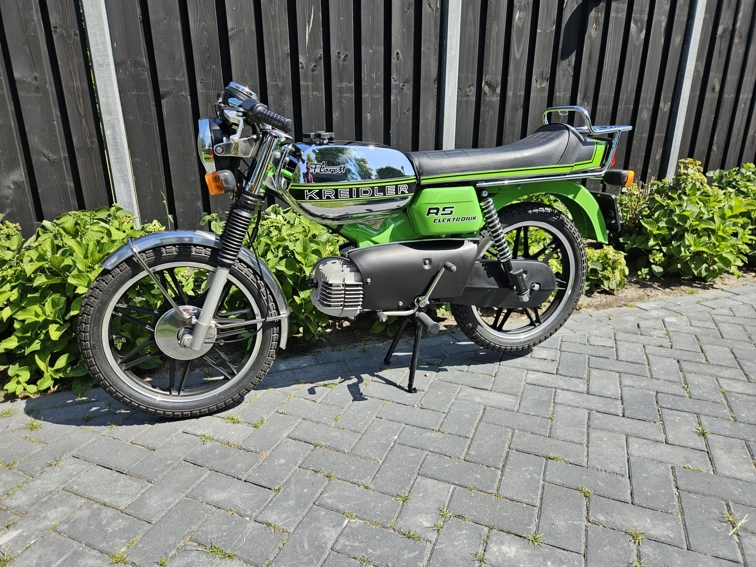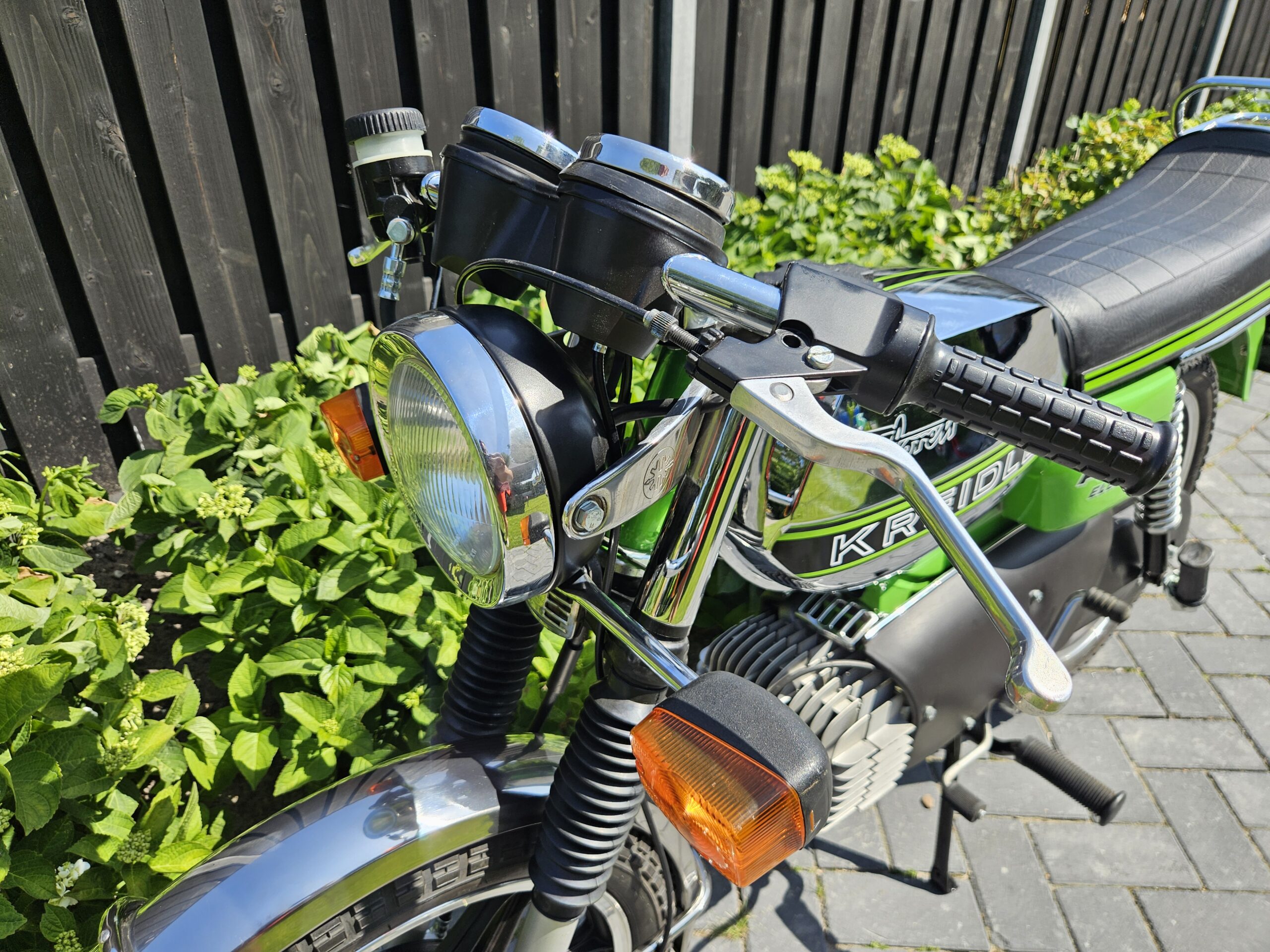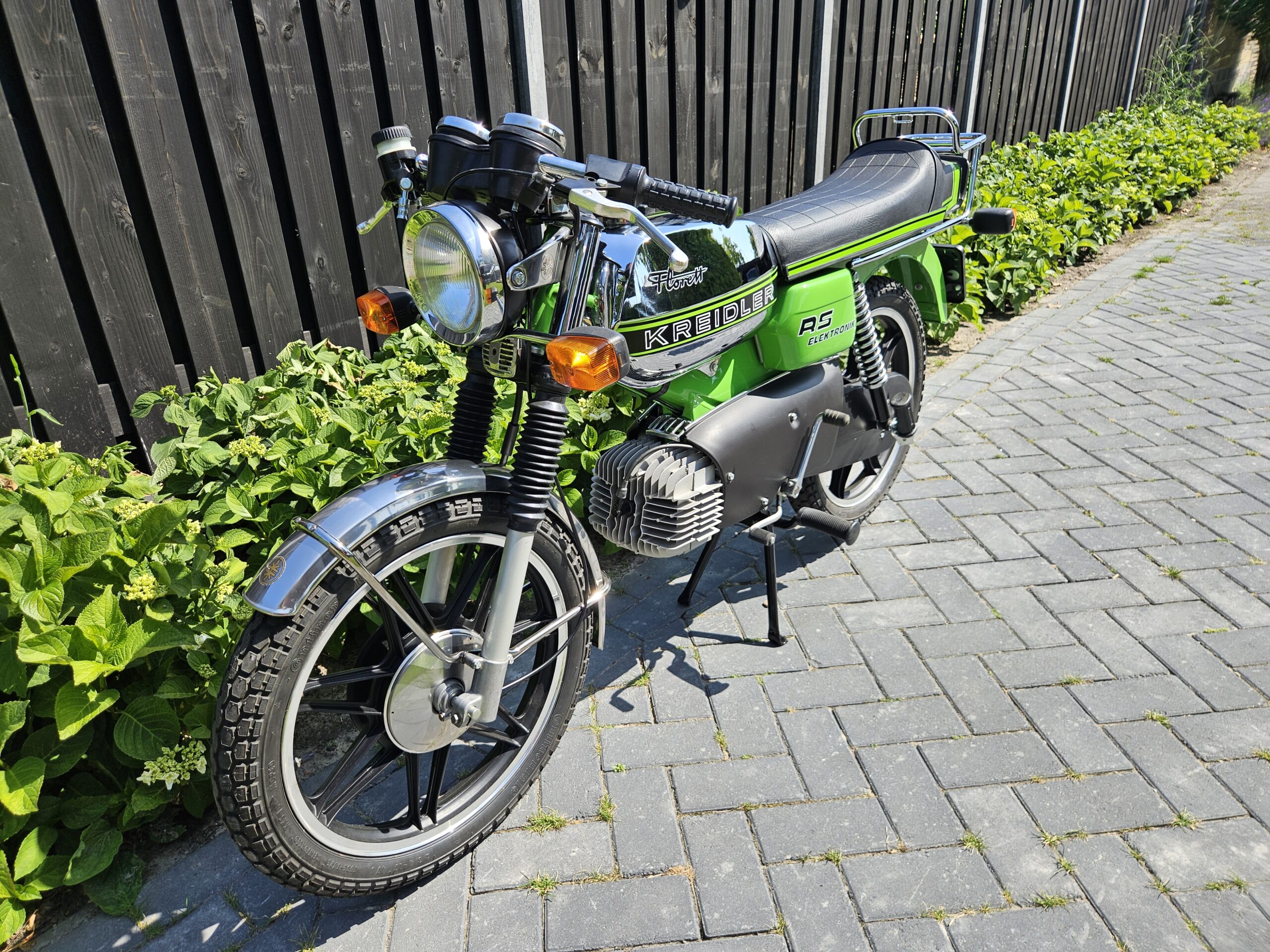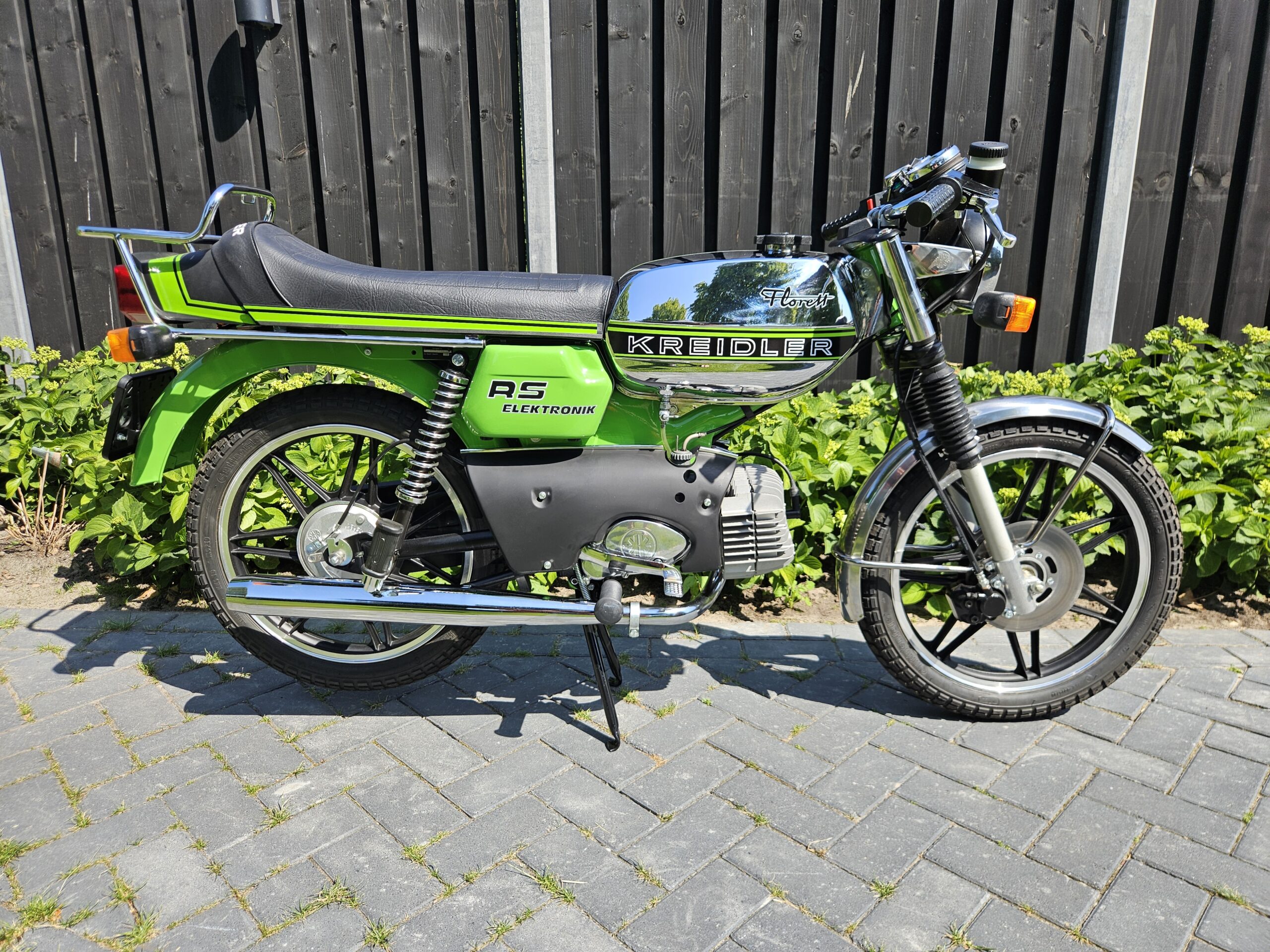 Deze Kreidler Florett RS-GS uit 1978 heeft namelijk nog maar 13 km op de teller na een volledige restauratie van hoge kwaliteit. Opgebouwd op een origineel Golfgrun RS frame (CH K54/511), maar gekeurd als bromfiets. De directe 5-bak motor loopt zoals het hoort en is helemaal gereviseerd. Prachtig om weg te zetten of om lekker mee te touren.