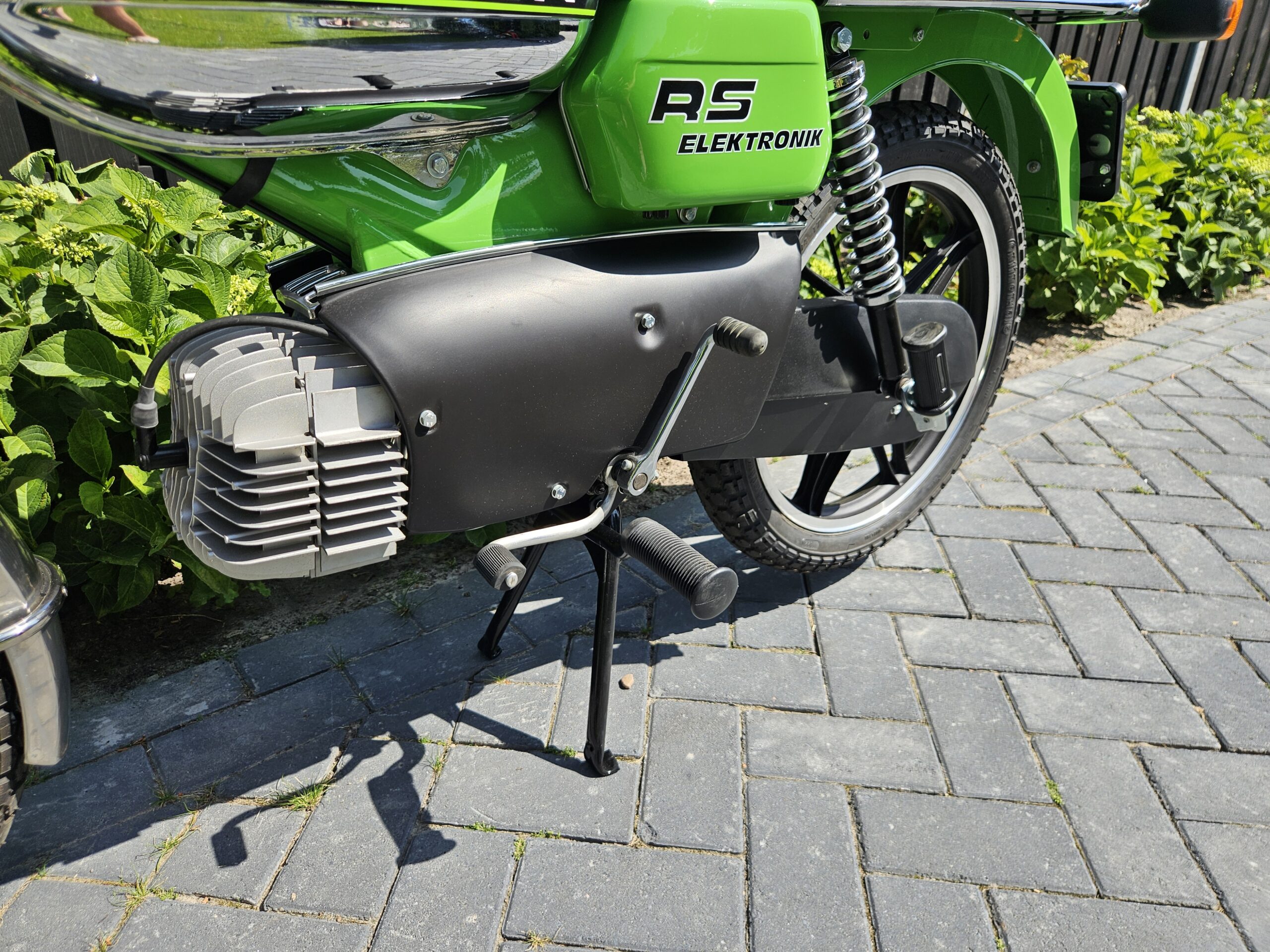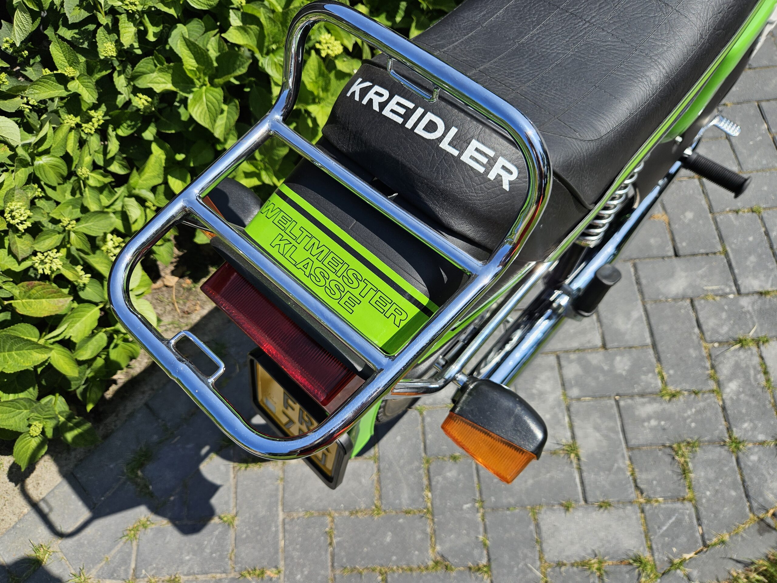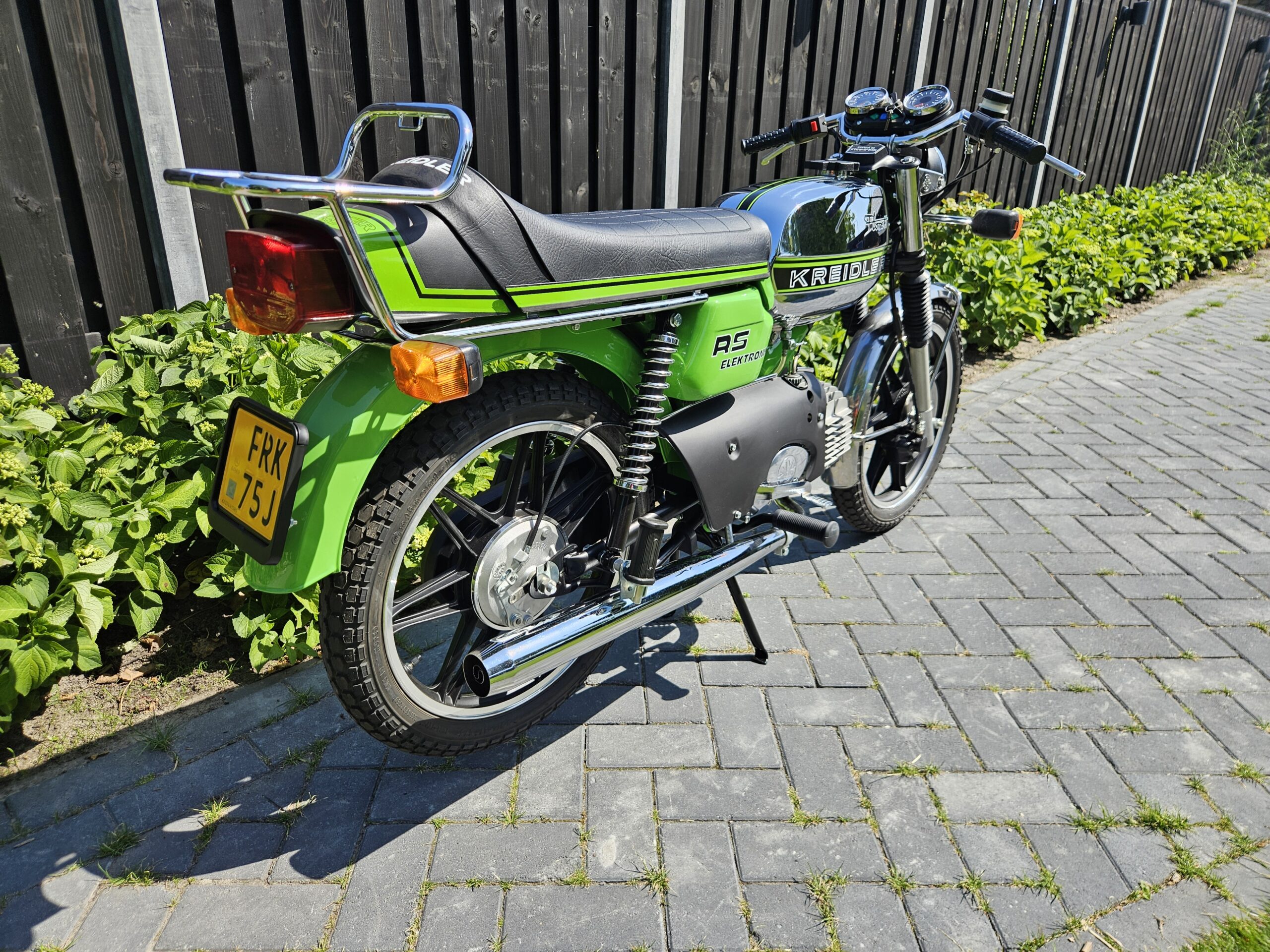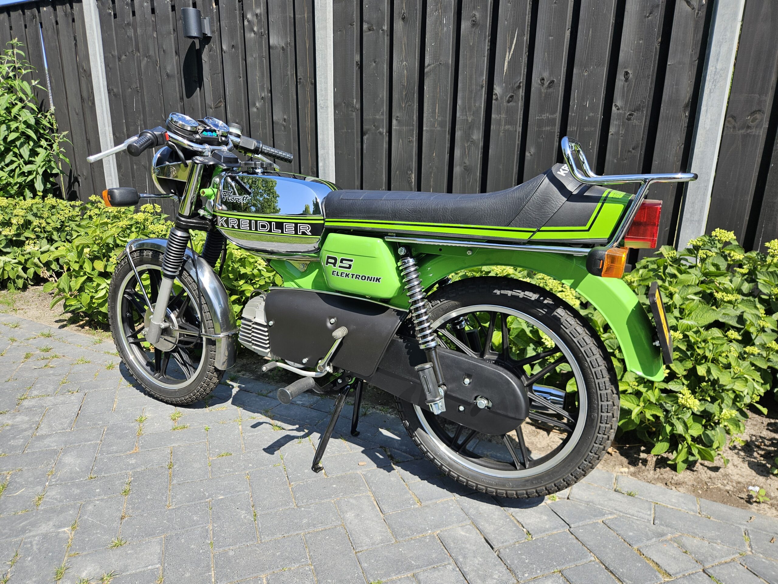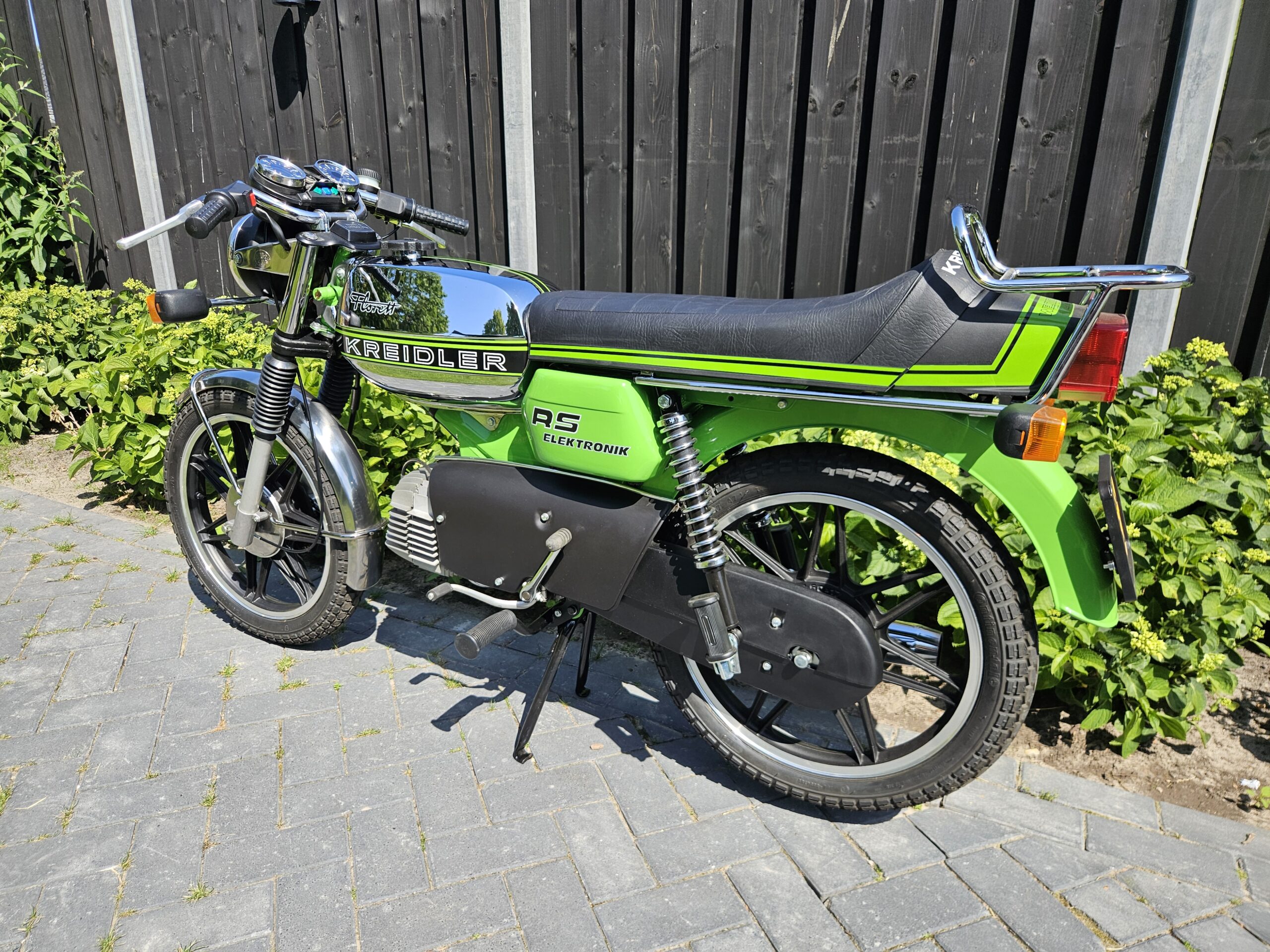 Deze Kreidler Florett RS-GS uit 1978 heeft namelijk nog maar 13 km op de teller na een volledige restauratie van hoge kwaliteit. Opgebouwd op een origineel Golfgrun RS frame (CH K54/511), maar gekeurd als bromfiets. De directe 5-bak motor loopt zoals het hoort en is helemaal gereviseerd. Prachtig om weg te zetten of om lekker mee te touren.