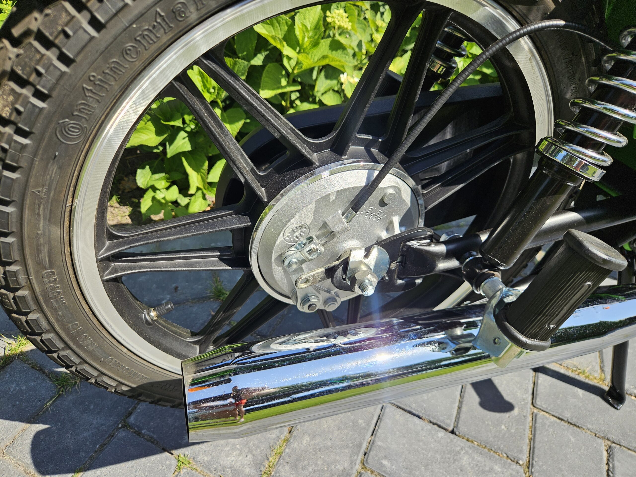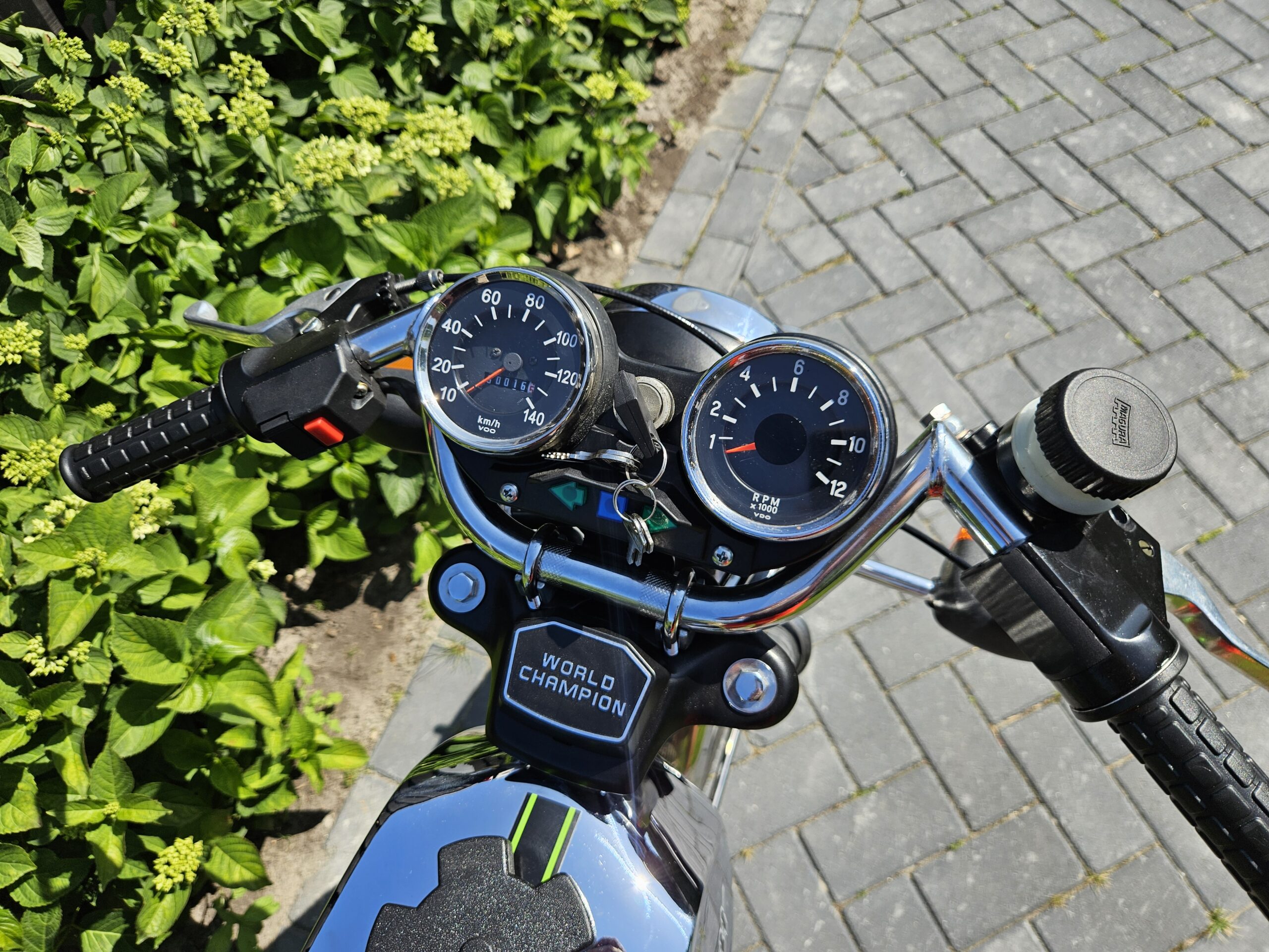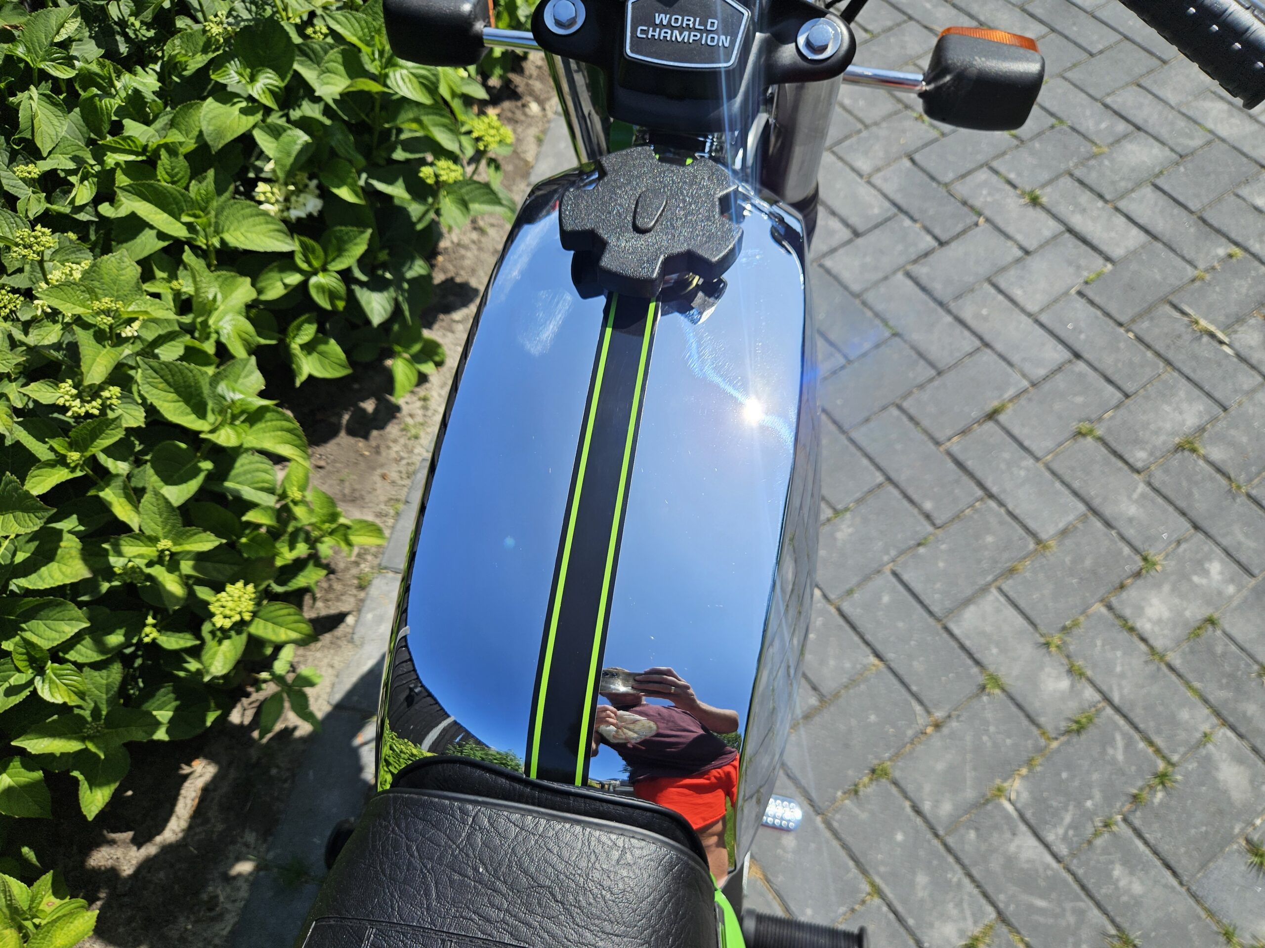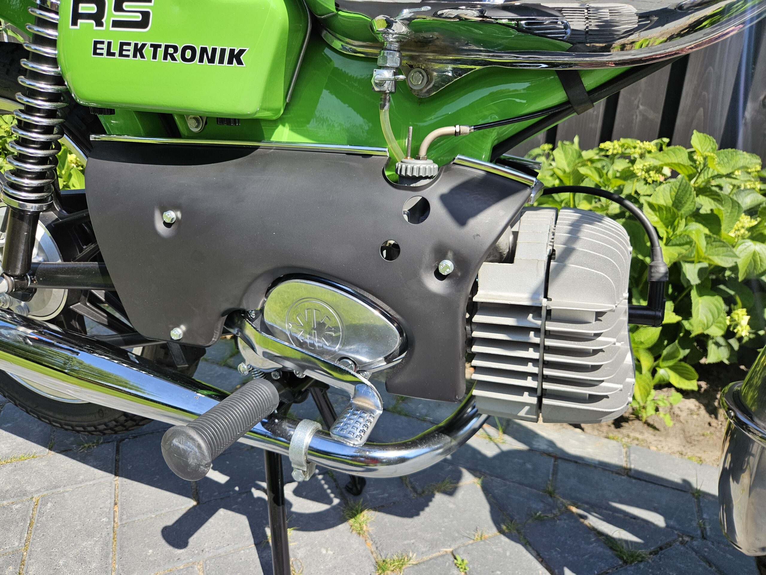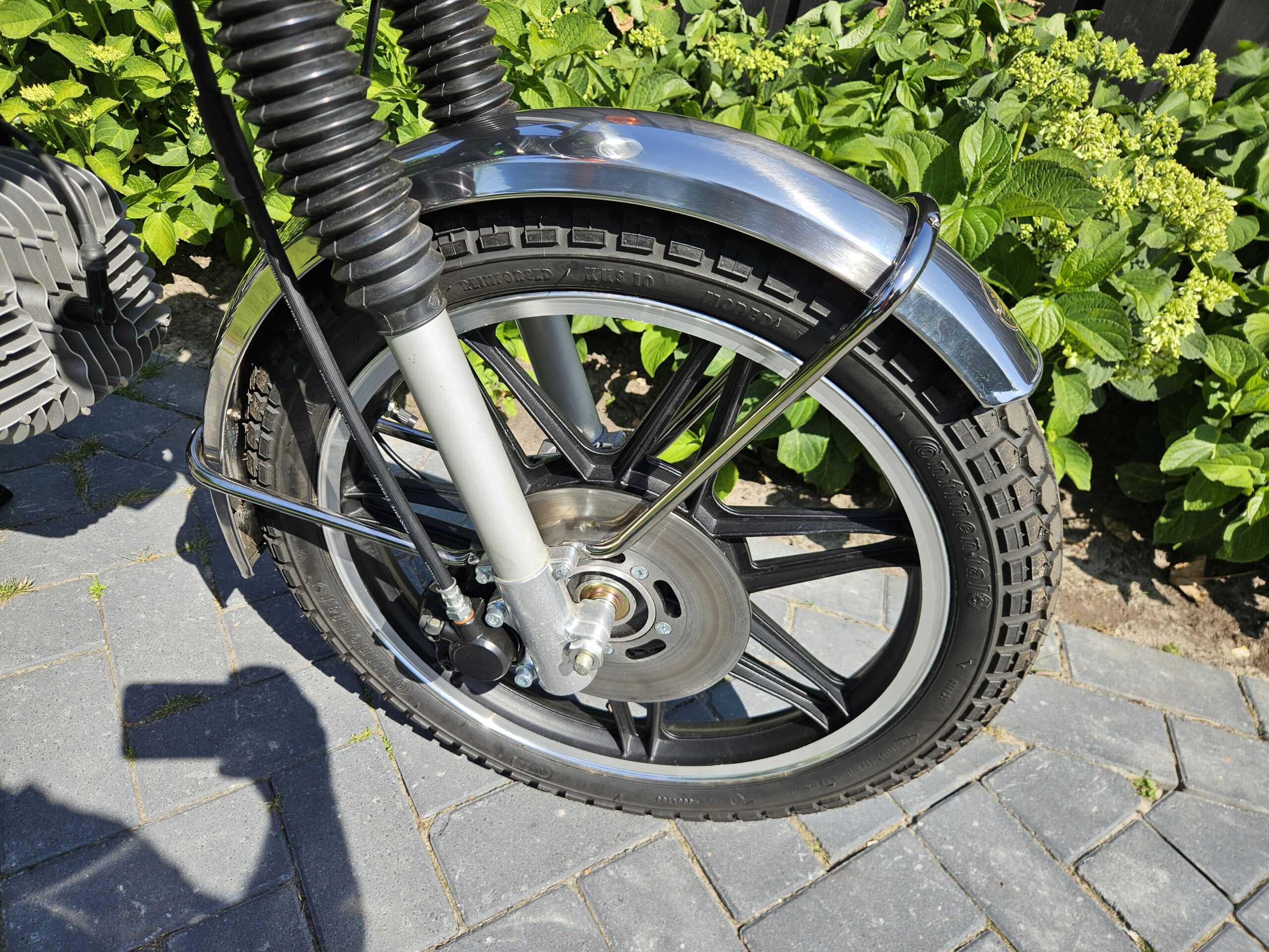 Deze Kreidler Florett RS-GS uit 1978 heeft namelijk nog maar 13 km op de teller na een volledige restauratie van hoge kwaliteit. Opgebouwd op een origineel Golfgrun RS frame (CH K54/511), maar gekeurd als bromfiets. De directe 5-bak motor loopt zoals het hoort en is helemaal gereviseerd. Prachtig om weg te zetten of om lekker mee te touren.