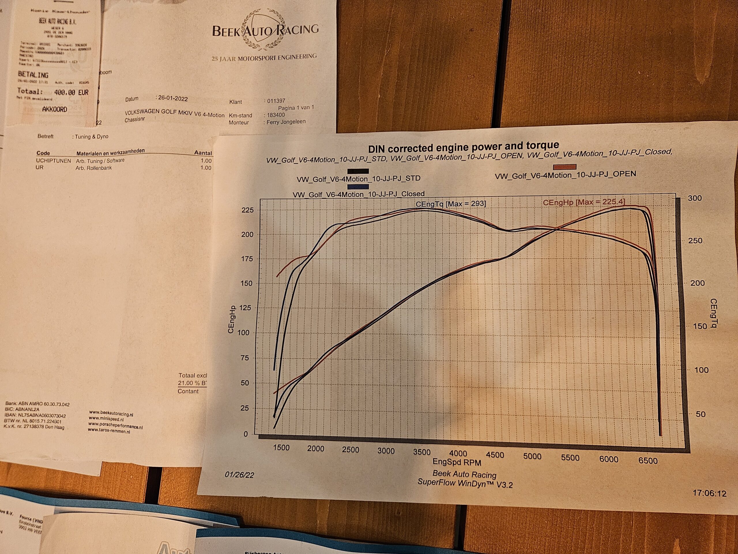 Auto is afgesteld op de rollenbank bij Beek Auto Racing (bekend van AutoWeek) op 225 pk.