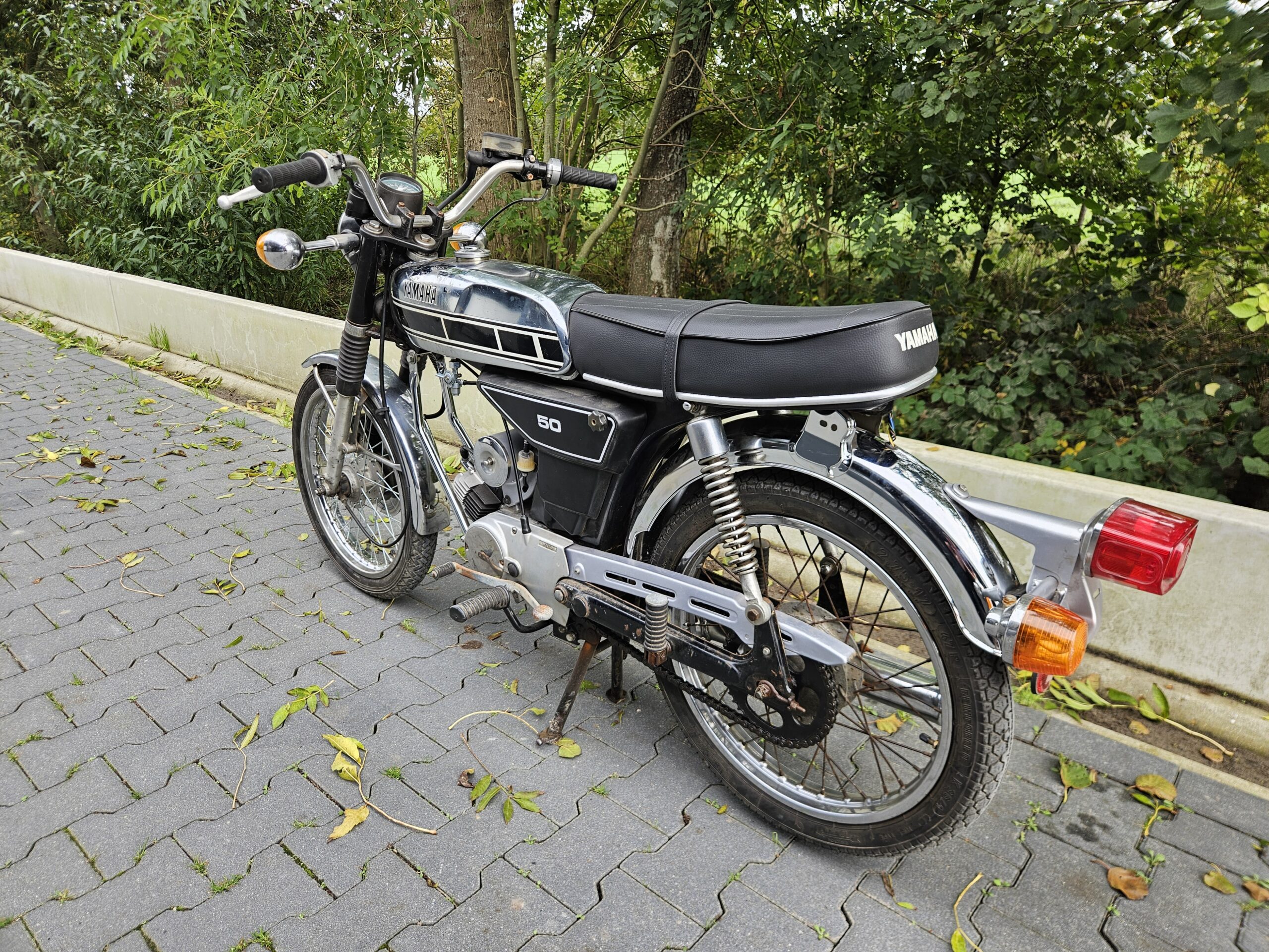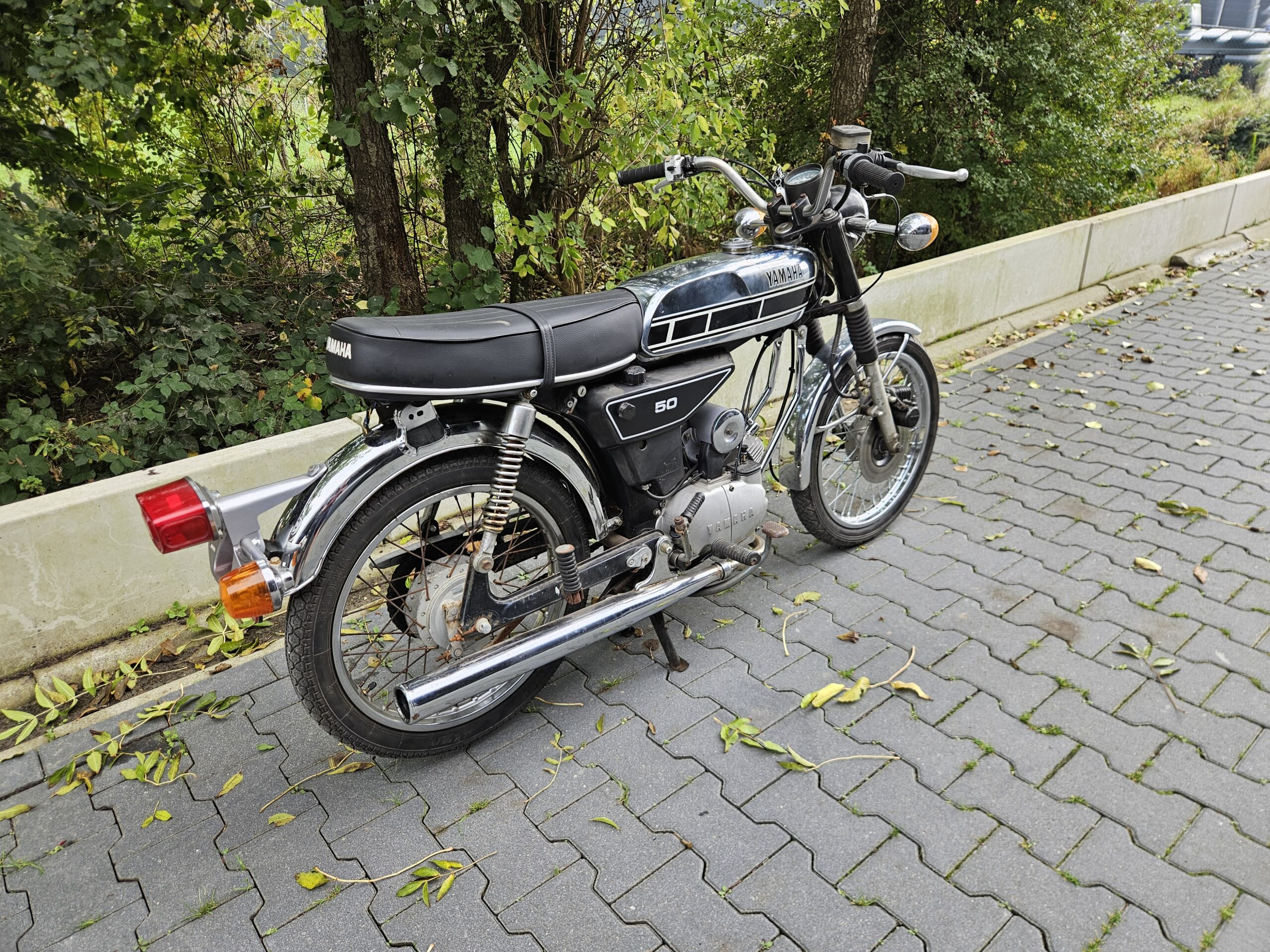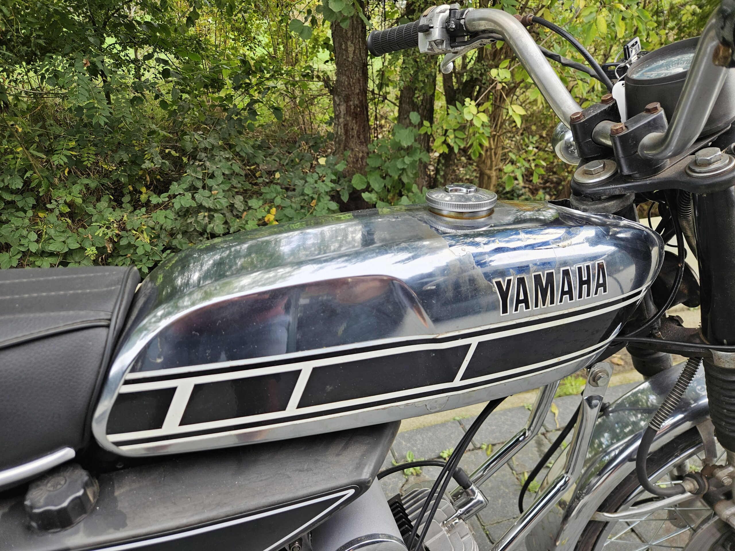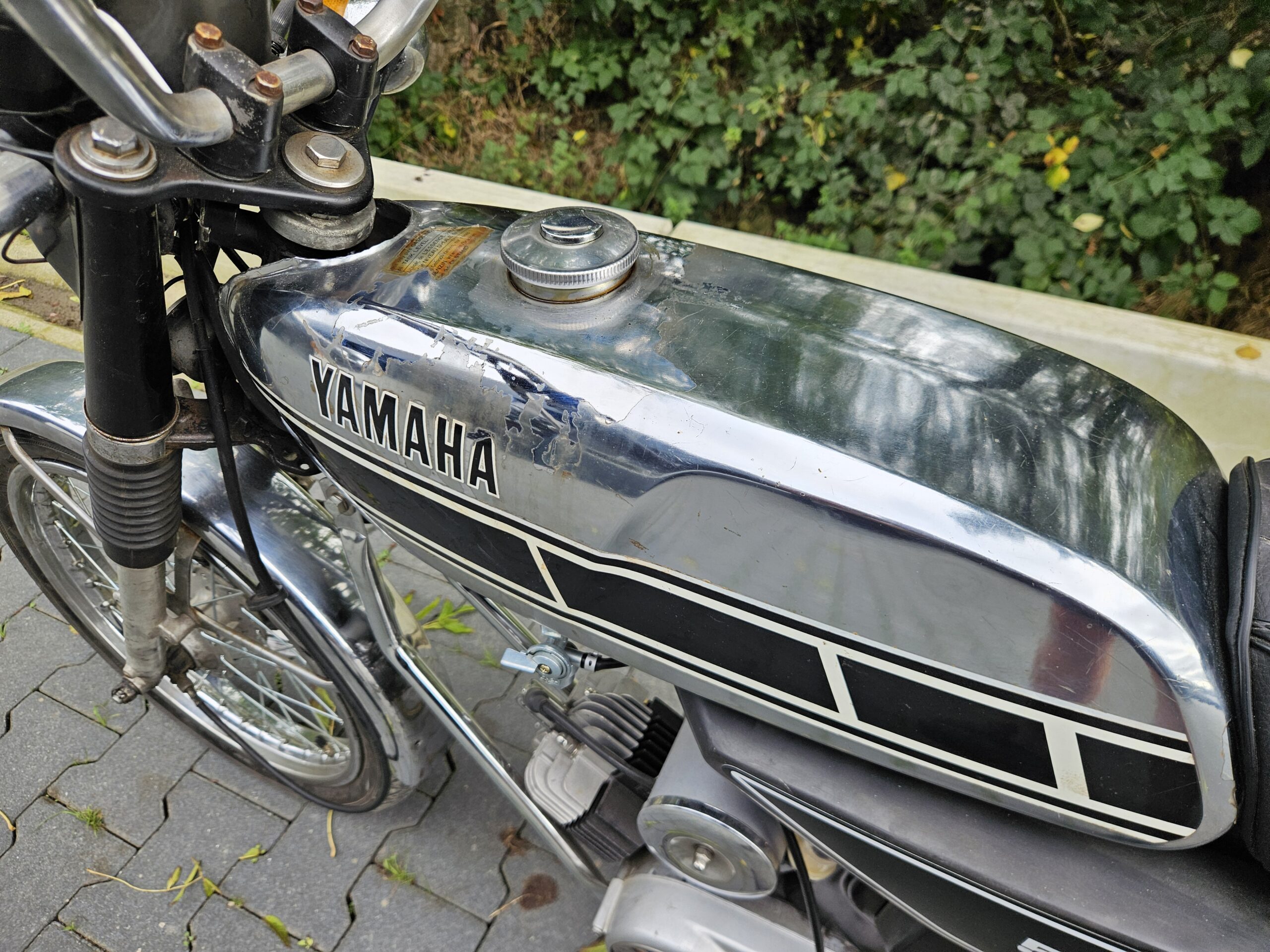 Mooie echte Yamaha FS-1 (468) met schijfrem en chrome tank. Matching nummers. Loopt en rijdt heel goed. De blanke lak op de tank laat los, deze kan eenvoudig verwijderd worden. Mooi overzichtelijk project of gewoon zo lekker touren. Duitse papieren zijn erbij, maar nog geen NL-kenteken.